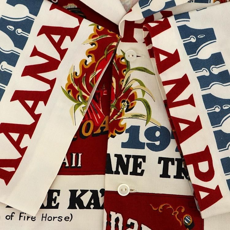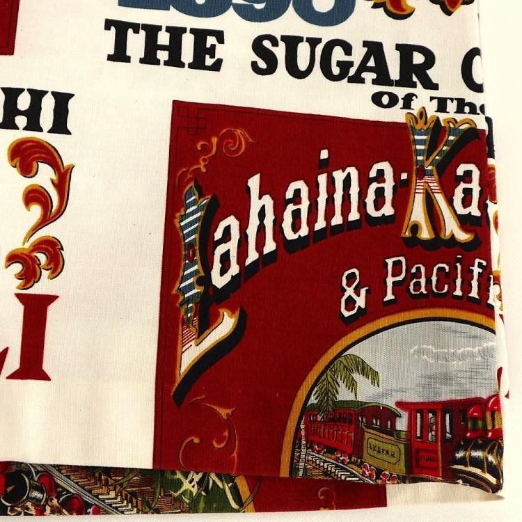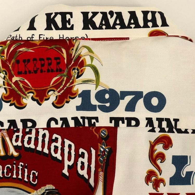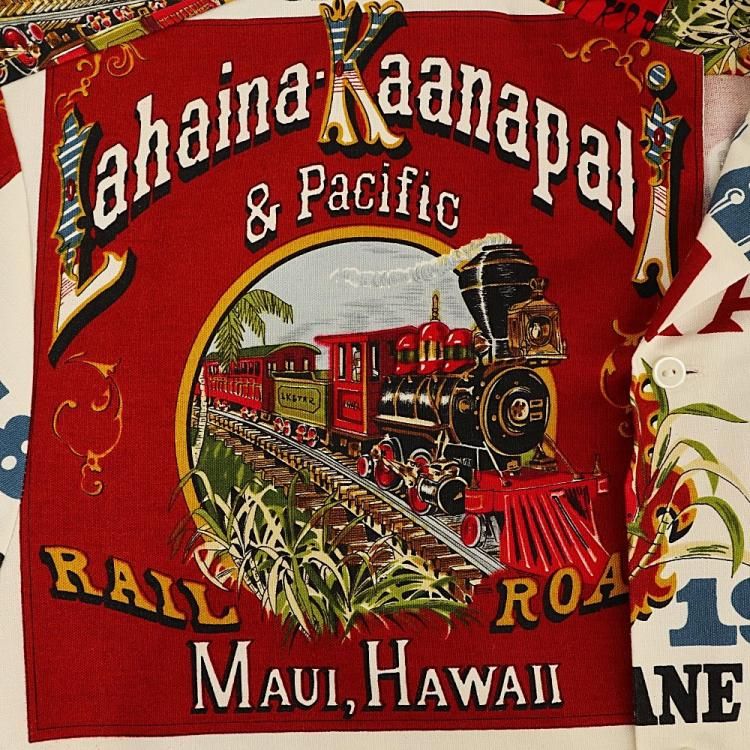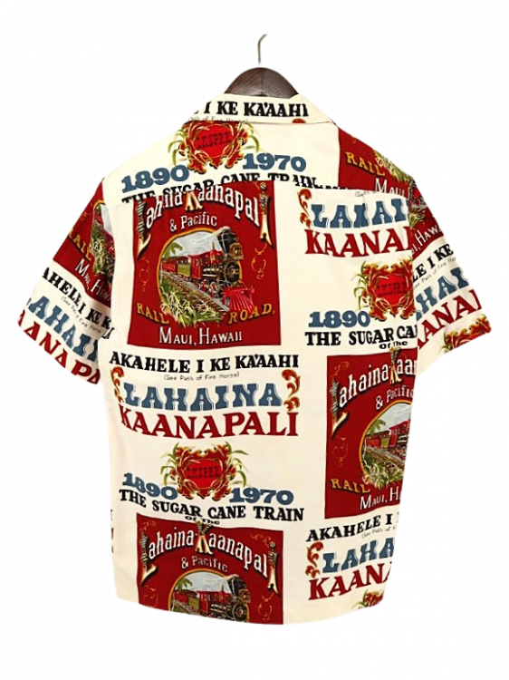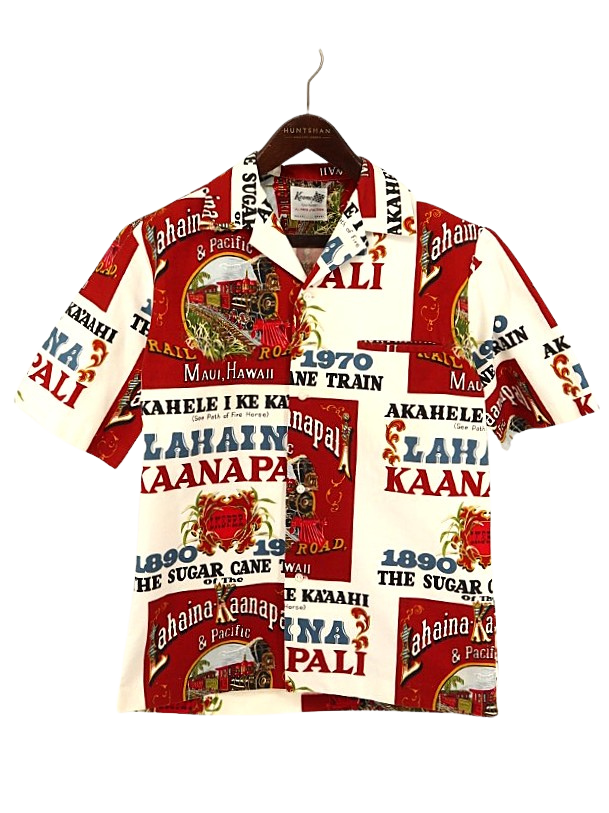 コメント:70年代頃の総柄ハワイアンシャツです。 プリントはアメリカ合衆国ハワイのマウイにあるラハイナ・カアナパリ・アンド・パシフィック鉄道の80周年を記念するデザイン。 ハリのあるコットン素材にアドバタイジング デザインが映えますね。