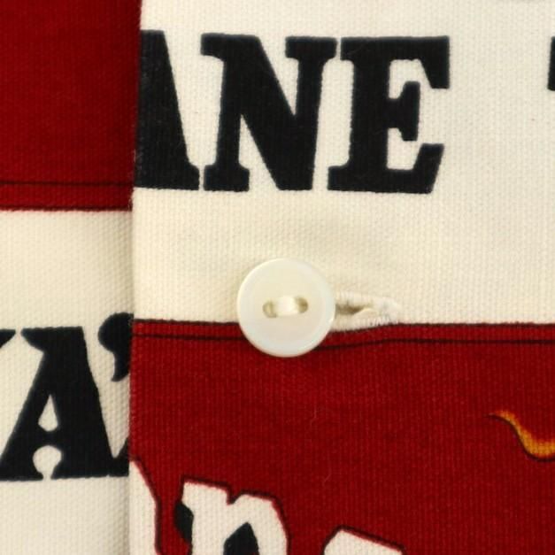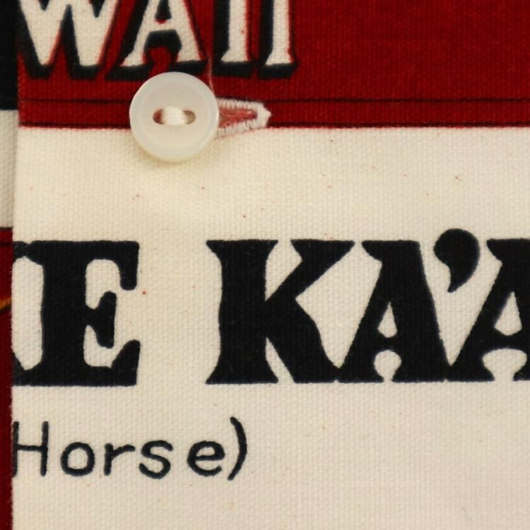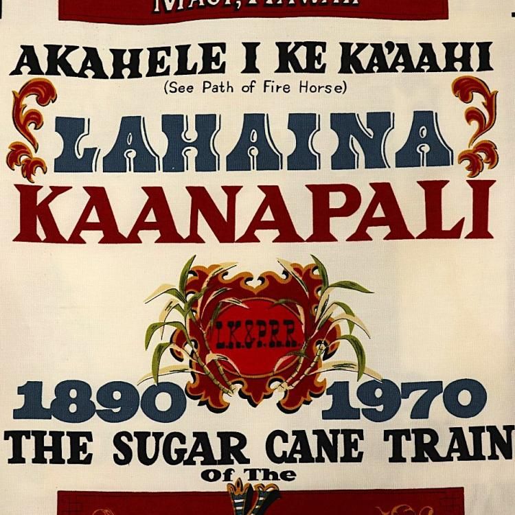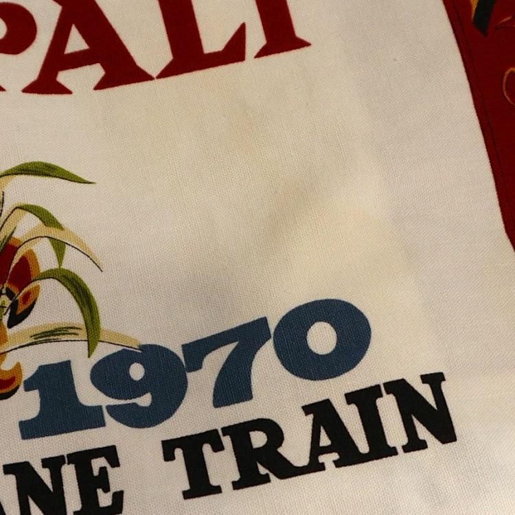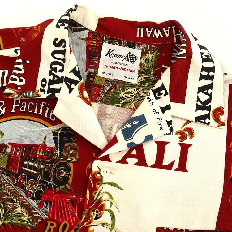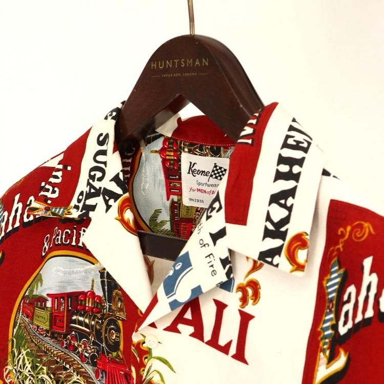 コメント:70年代頃の総柄ハワイアンシャツです。 プリントはアメリカ合衆国ハワイのマウイにあるラハイナ・カアナパリ・アンド・パシフィック鉄道の80周年を記念するデザイン。 ハリのあるコットン素材にアドバタイジング デザインが映えますね。