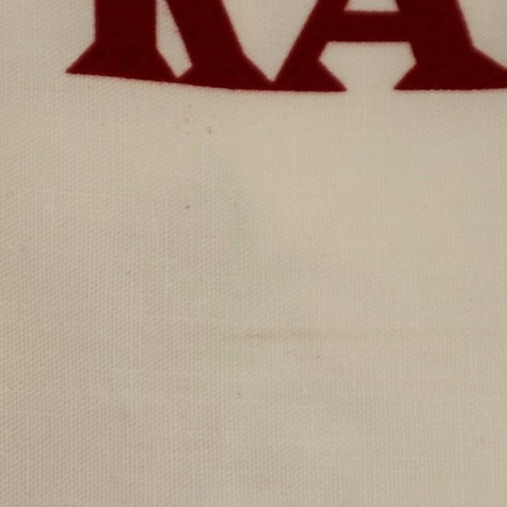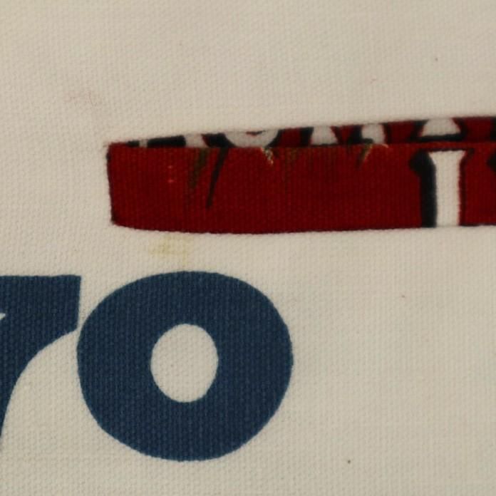 首元と後ろ真ん中少し下付近にに汚れ、白い部分に若干の黄ばみと複数ヶ所シミ、白い部分の所々に赤の繊維交じりがあります。