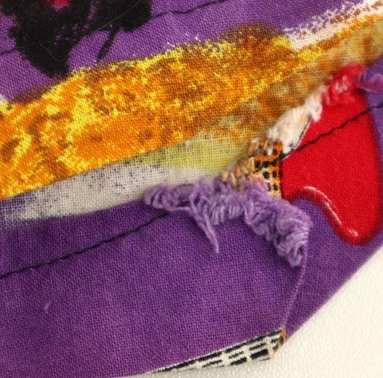 若干の毛羽立ち、首元に使用感とほつれ、所々にシミ、裾に裁縫不良があります。