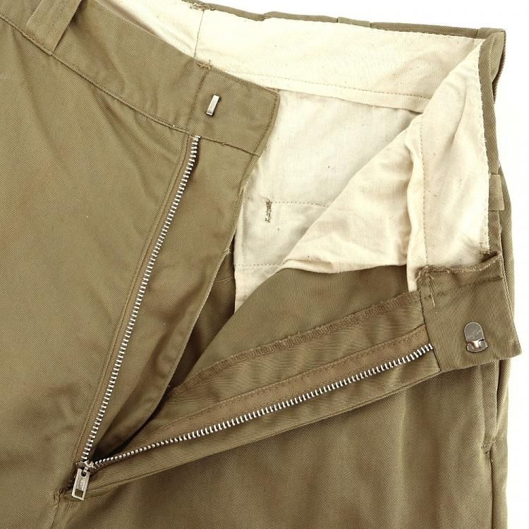 コメント:69年コントラクト ヴィンテージ U.S.ARMYの ユーティリティパンツ。  光沢のあるコットンツイル生地を使用したベーシックなストレートのチノパンツ。 WALDES の両爪ジップにTALON のホックを装備。 変わらぬ良さがありますね。 こちらは小さめサイズになるので女性の方にもおすすめです。