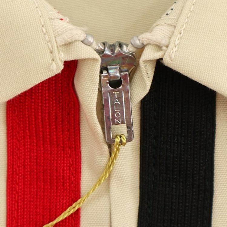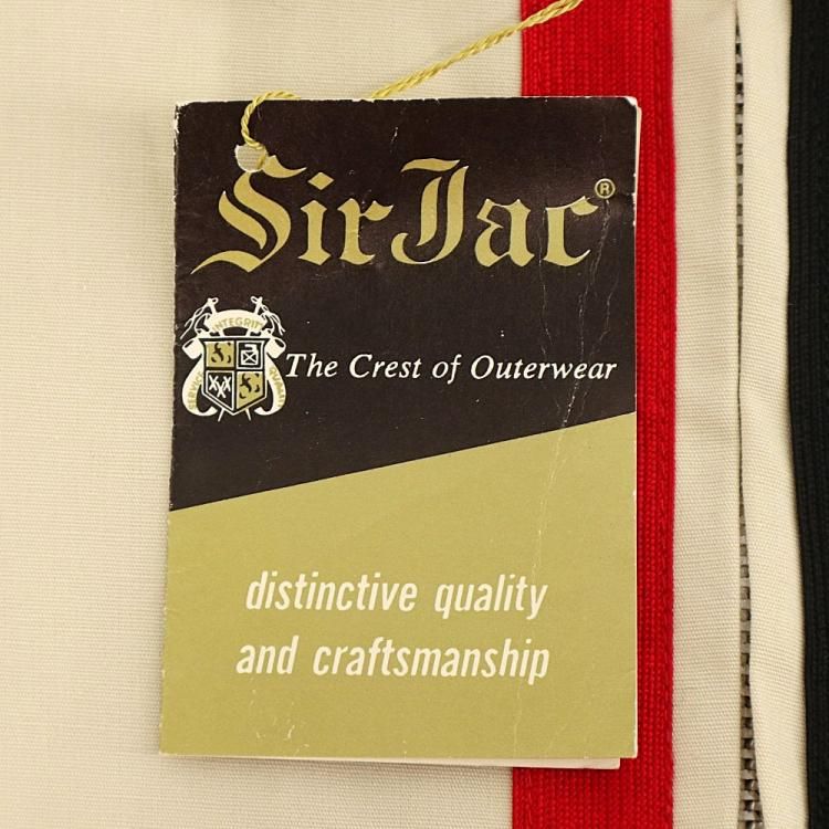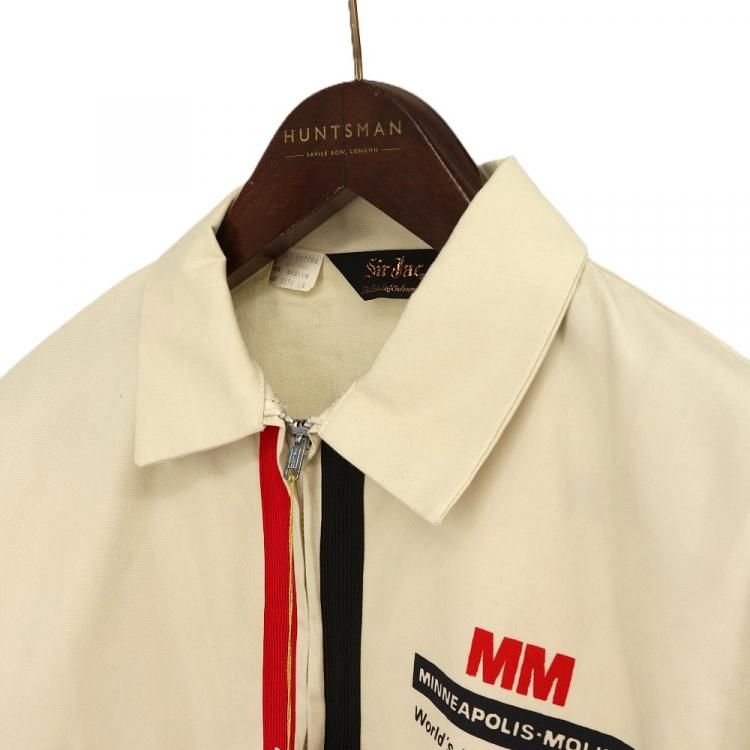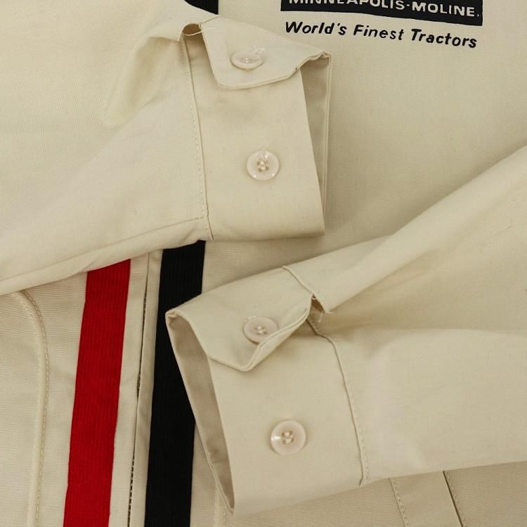 コメント:50~60年代ヴィンテージのSir Jac 製ブルゾンです。 ベージュの定番スイングトップに赤と黒のテープが貼られ、TALON ピンロック ジップを使用。 フラッシャーに " MADE IN THE UNITED STATES " の記載があります。 当時MINNEAPOLIS MOLINE というトラクターで有名な企業のプリントが左胸に入ります。