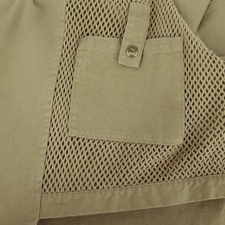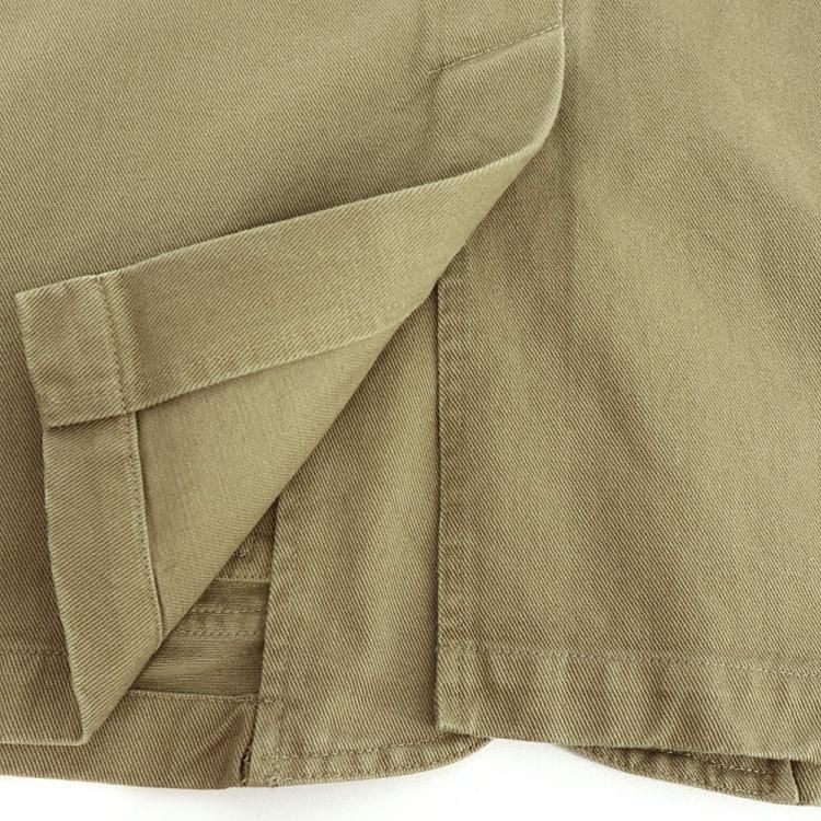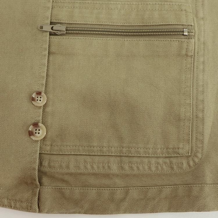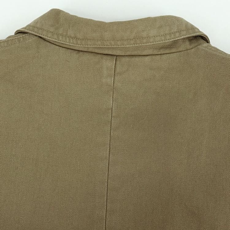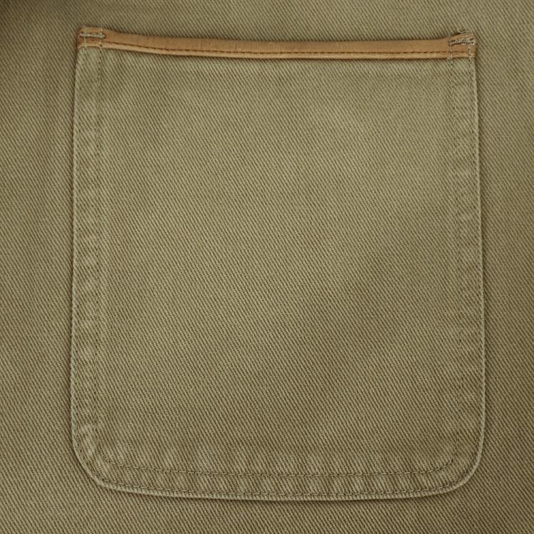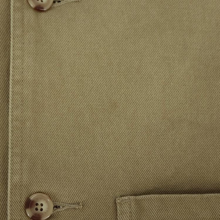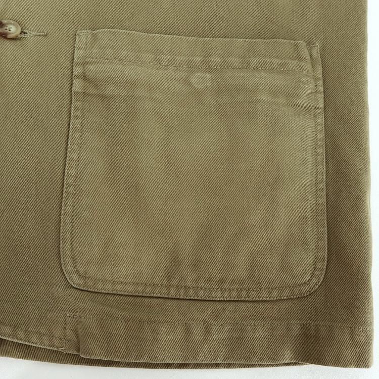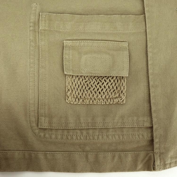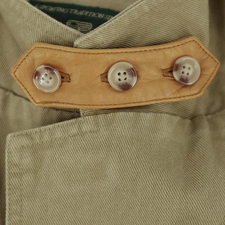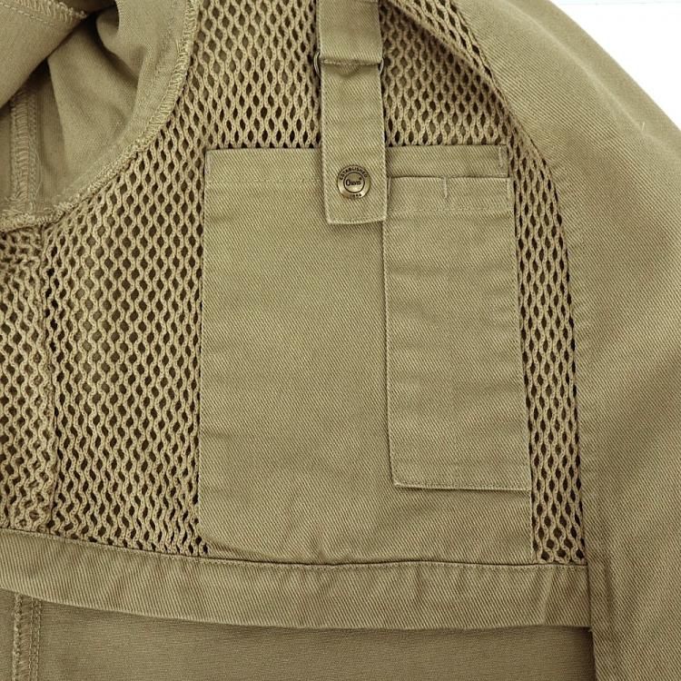 コメント:90年代の orvis コットン ジャケットです。 エルボーパッチ・チンストラップ・胸ポケット口・袖口のトリム等にレザーが使われたワンランク上のハンティングジャケット。 裏の上部にはメッシュ素材が貼られており、内ポケットも充実しています。 左腰のパッチポケットの中にもジップで開閉できるポケットが内蔵されています。 ちょっとした細かい荷物ならカバン無しでも済みそうな収納力があります。
