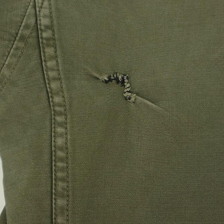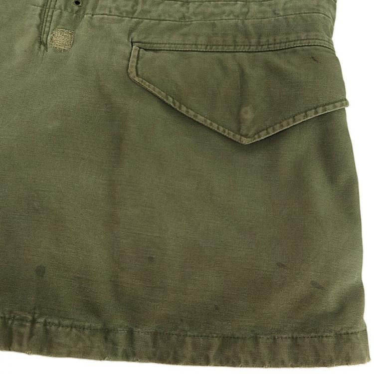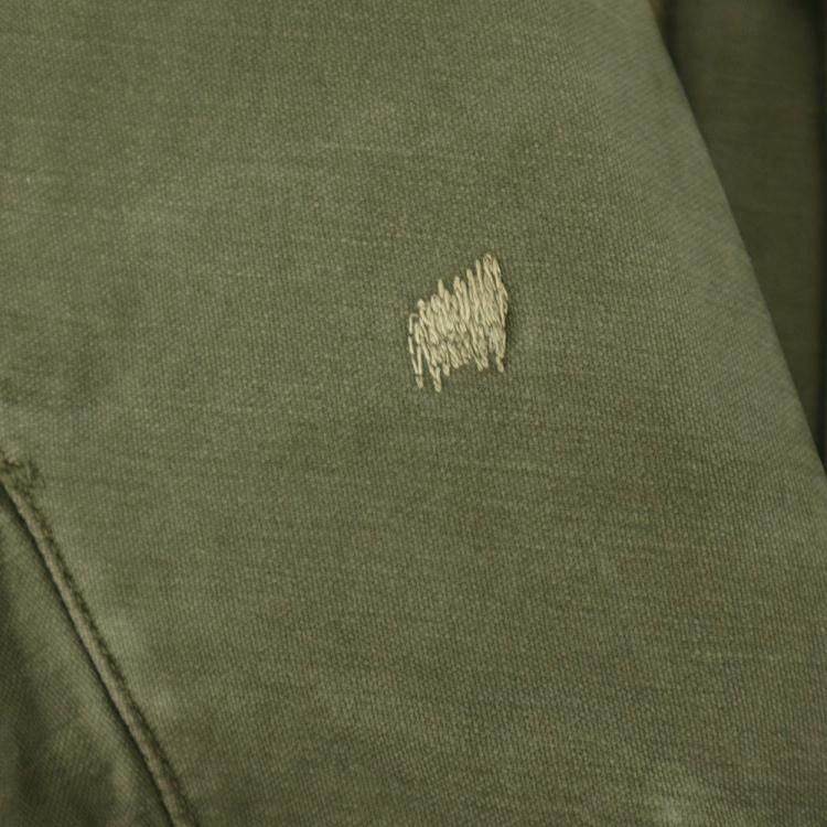 腰・裾のドローコード欠損、腕と胸にはワッペン・テープを外した跡があり、タグに切り取りと書き込み、右胸ポケットスナップボタン変形、両袖口ボタン欠けと破れ、所々にシミ、汚れ、補修跡があります。