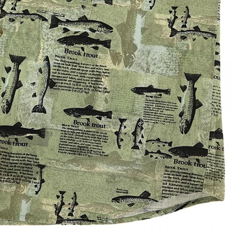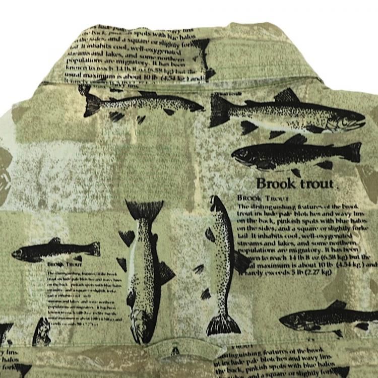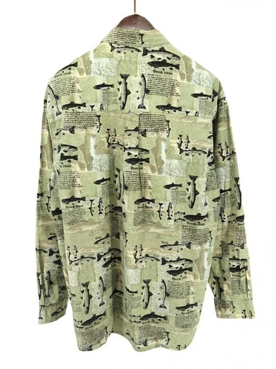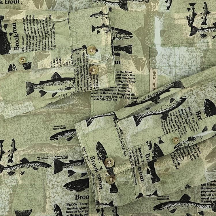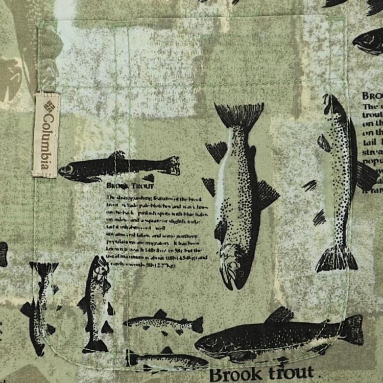 コメント:90~00年代 Columbia 総柄プリントシャツです。 BROOK TROUT和名カワマス柄。フィッシングシャツではなく普通のBDシャツにこのプリント。 これを着こなせたら上級者ですね。 ポケットは柄合わせされています