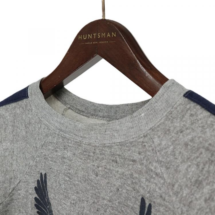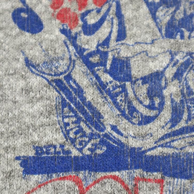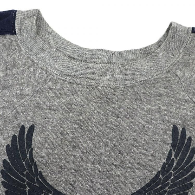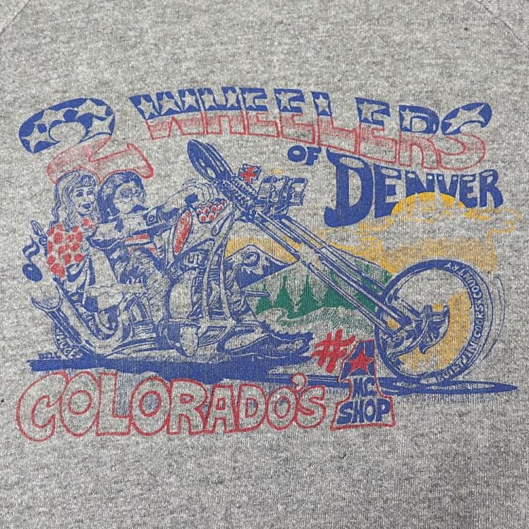コメント:おそらく70~80年代ヴィンテージ ハーレー イーグル プリント のスウェットトレーナーです。 霜降り強めの濃いグレーボディに腕には別生地のネイビーラインが張り付けられています。 バックにはコロラド州デンバーのモーターサイクル店 2 Wheelers のプリントがあり、創業した1970年にデザインされた物で、今年55周年を迎え同じプリントの55周年バージョンのアイテムを販売しています。 こちらはハーレーのオフィシャルではないと思われます。