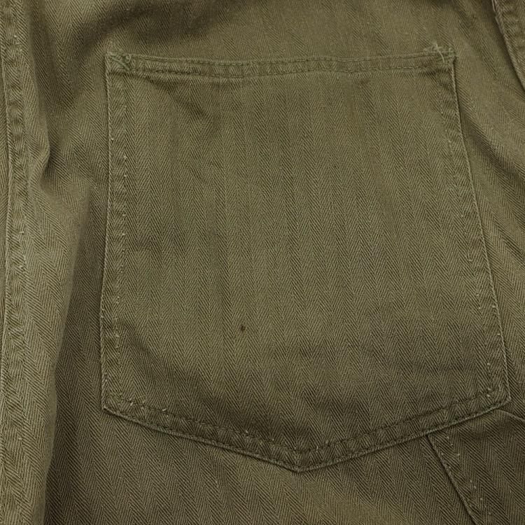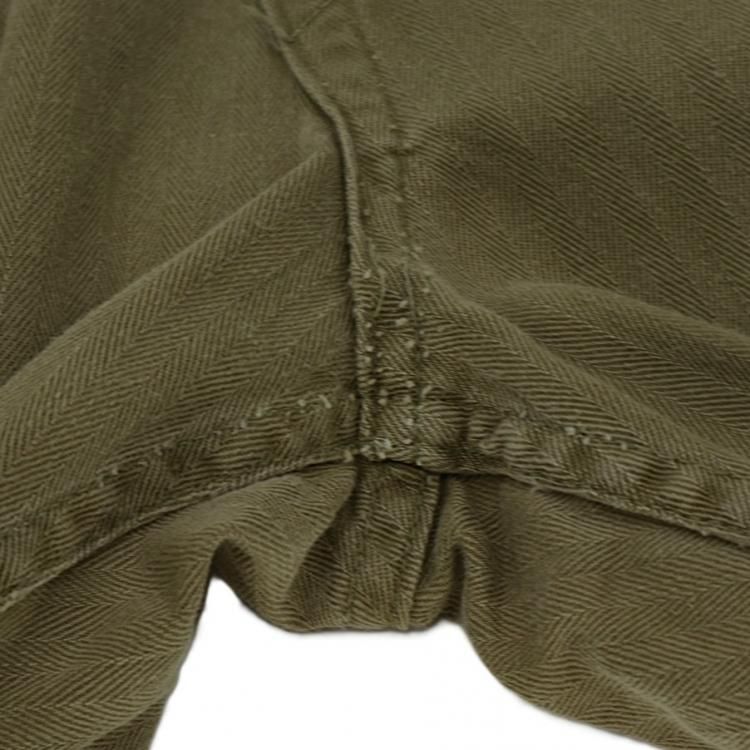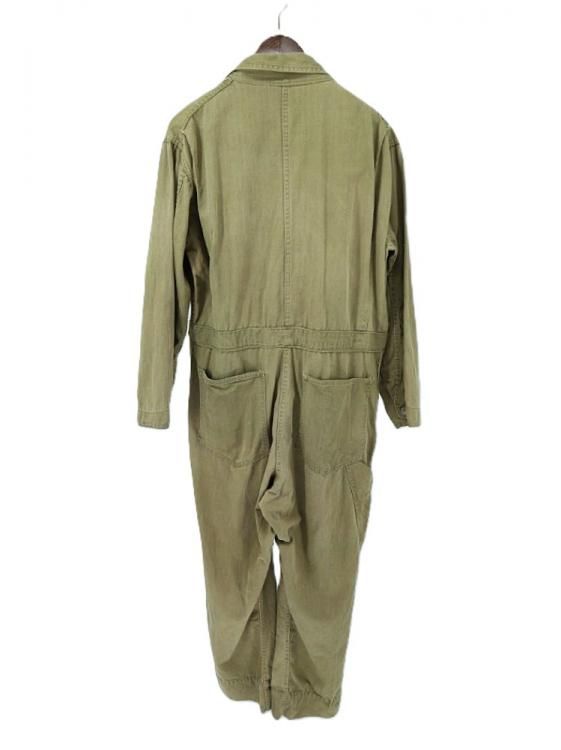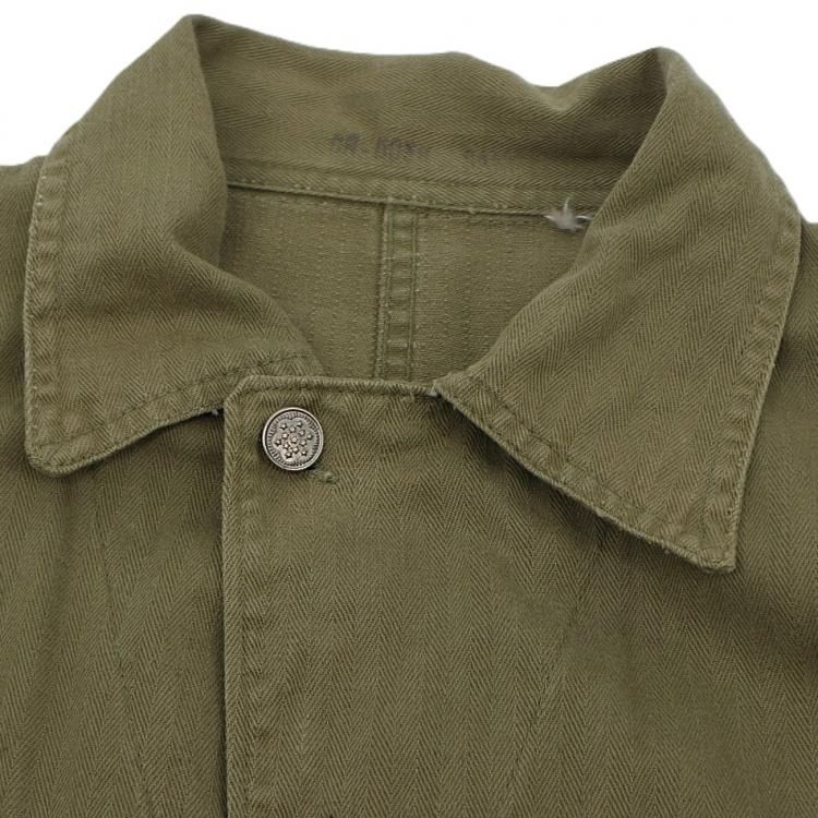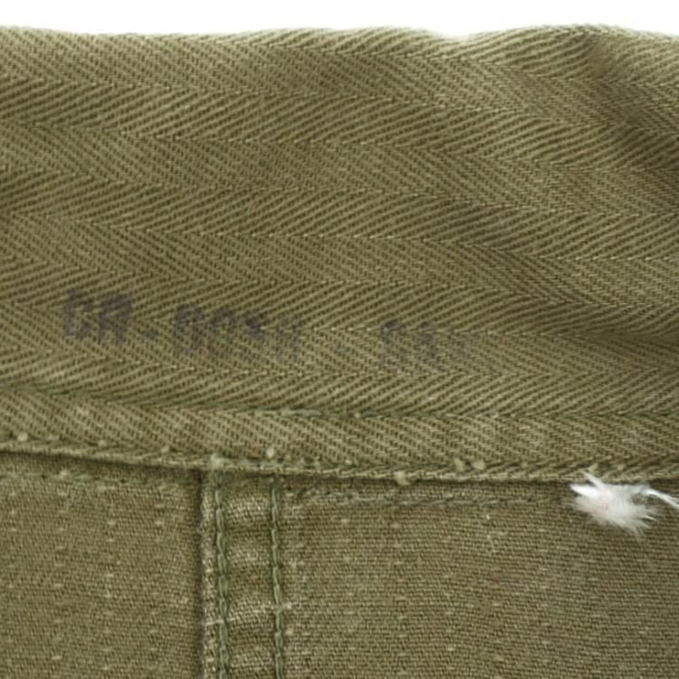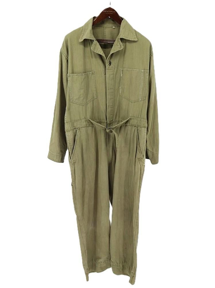 コメント:おそらく30~40年代あたりのヴィンテージ ツナギ です。 詳細は不明ですが、HBT生地に13スターボタンが使われています。 この年代のデニムのオールインワンと同じくボタンフライの比翼仕立てで、トップと第2ボタンの間隔が広くなっています。 謎なのが13スターボタンにラッカー塗装されていない点です。 ただ受け側には塗装残りがあります。 襟の内側にステンシルがありますので軍モノだとは思いますがお手上げです。 かなりの珍品の可能性があり、今後出会えないモノだと思いますので、気になった方は是非。