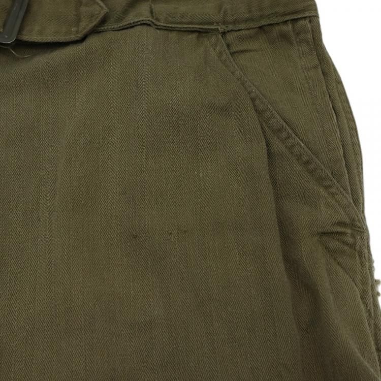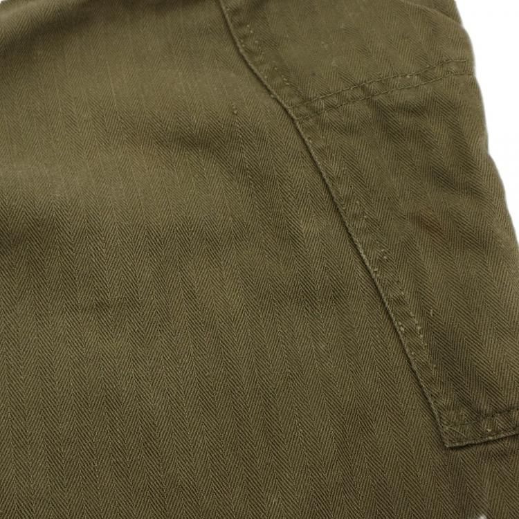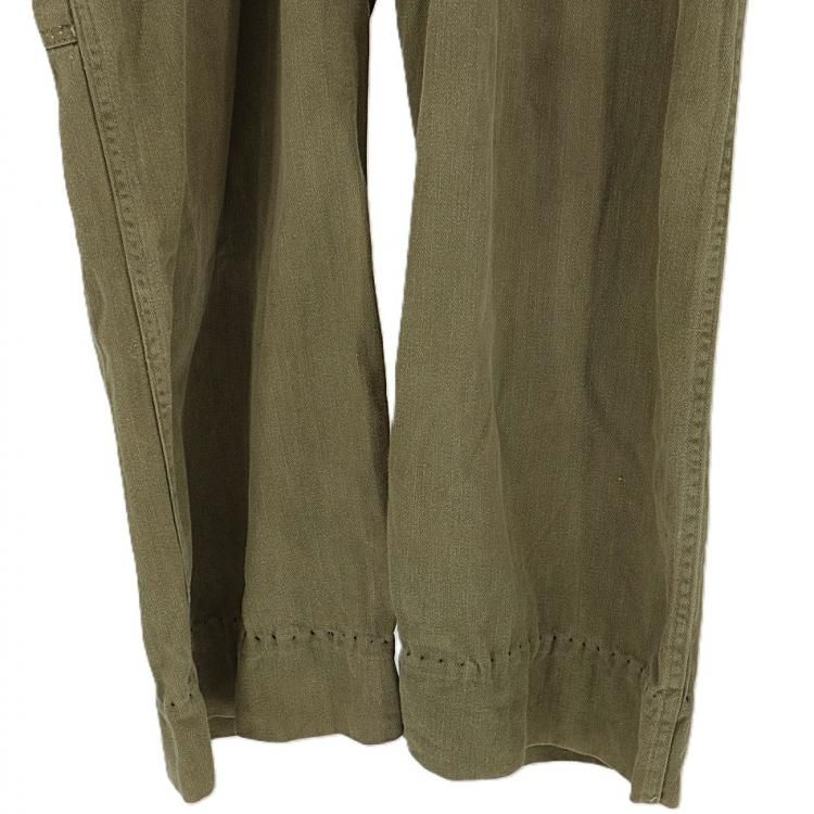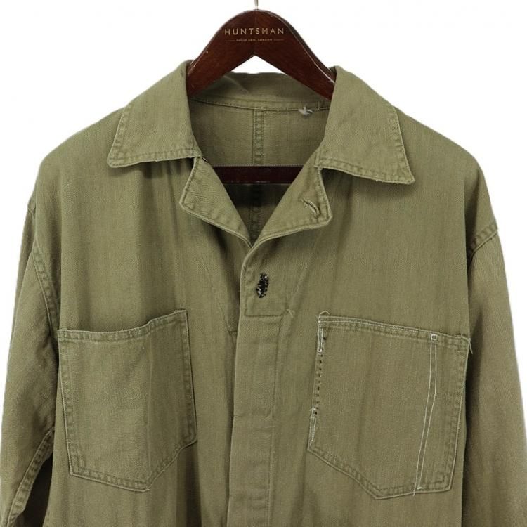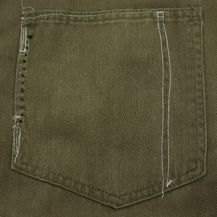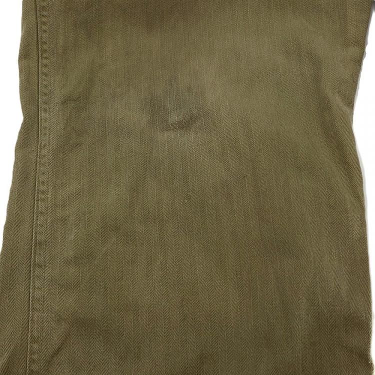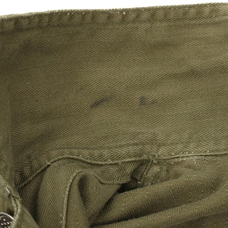 コメント:おそらく30~40年代あたりのヴィンテージ ツナギ です。 詳細は不明ですが、HBT生地に13スターボタンが使われています。 この年代のデニムのオールインワンと同じくボタンフライの比翼仕立てで、トップと第2ボタンの間隔が広くなっています。 謎なのが13スターボタンにラッカー塗装されていない点です。 ただ受け側には塗装残りがあります。 襟の内側にステンシルがありますので軍モノだとは思いますがお手上げです。 かなりの珍品の可能性があり、今後出会えないモノだと思いますので、気になった方は是非。