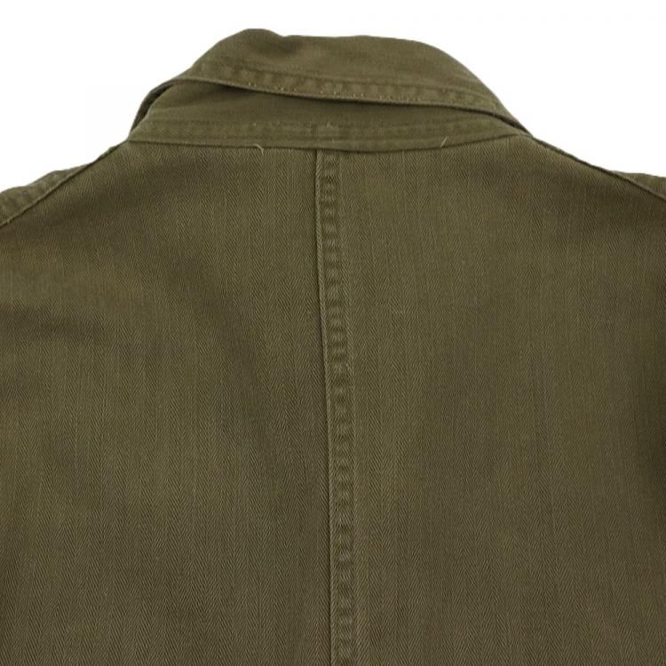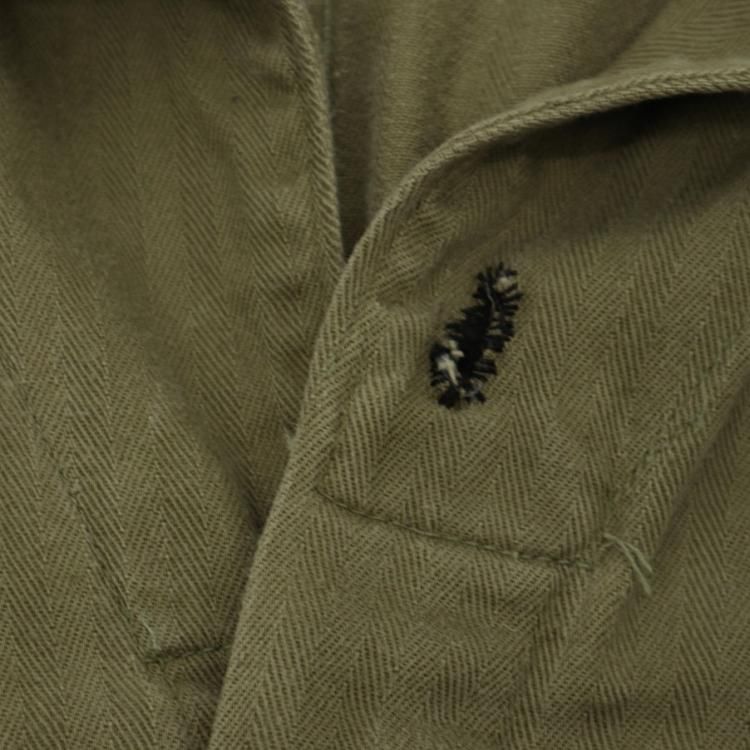 トップと第2ボタンの間にボタンホール穴が作られています。左胸ポケットに補修跡、裾上げ、所々に若干の使用感と汚れとシミがあります。