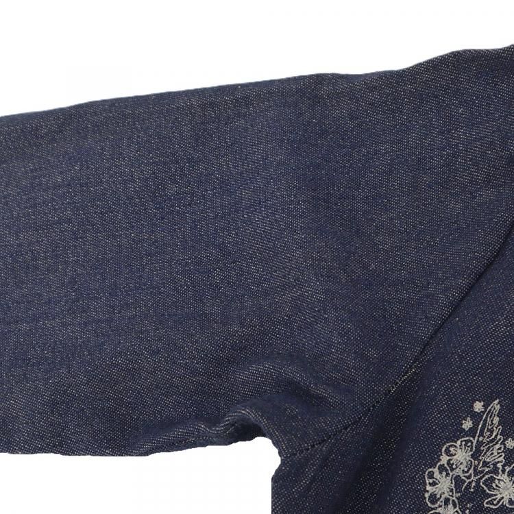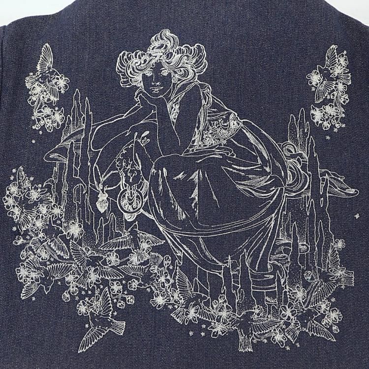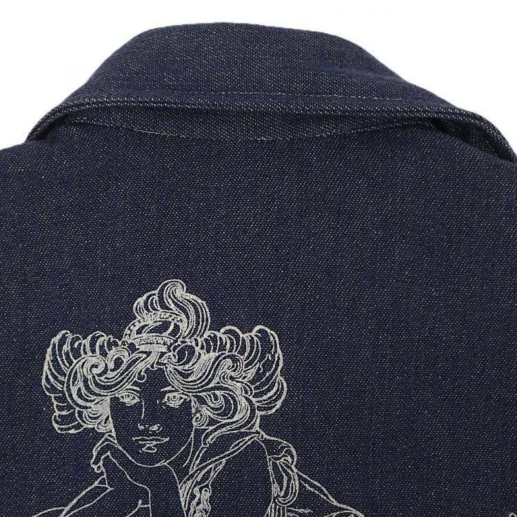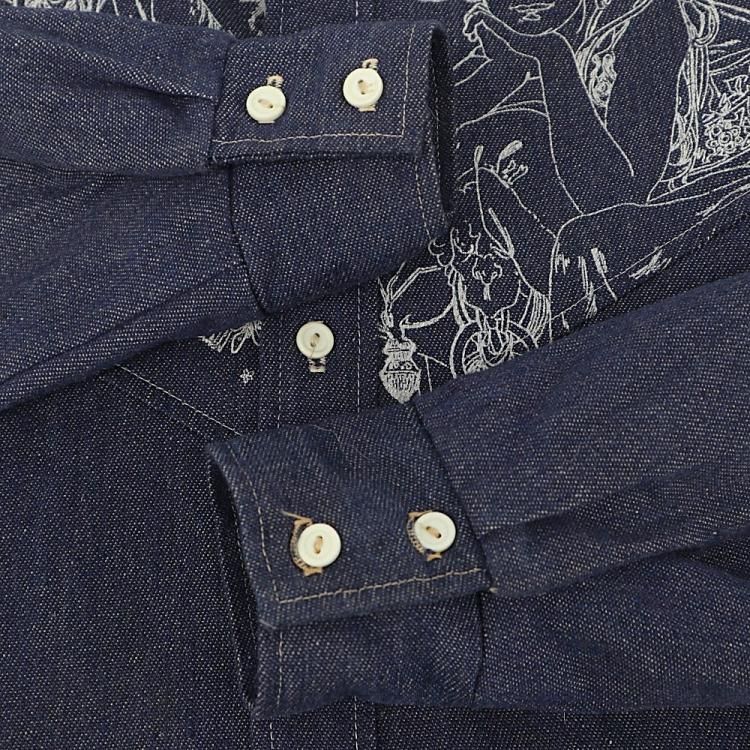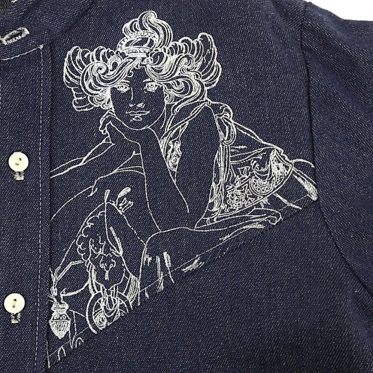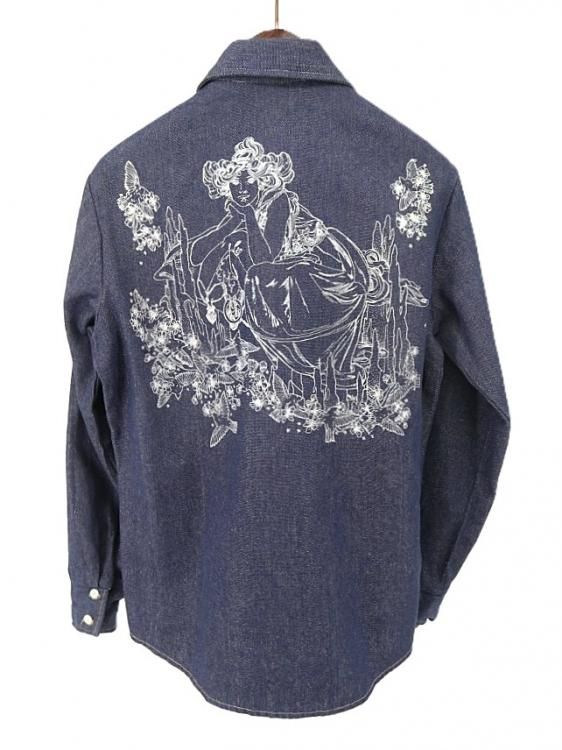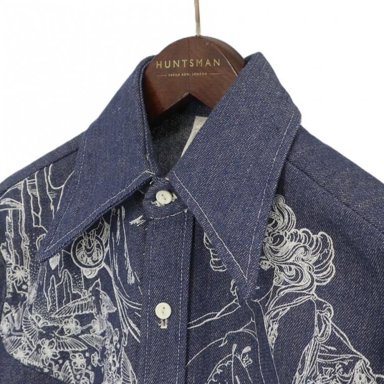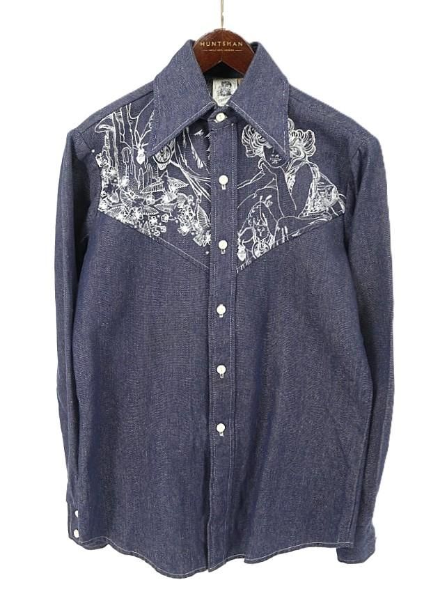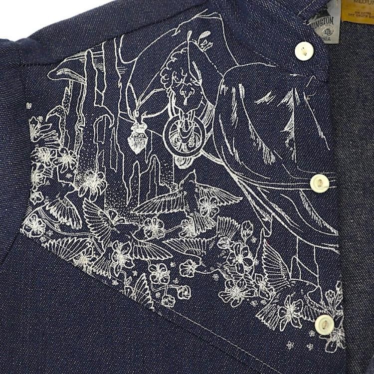 コメント:70年代ヴィンテージ ケニントンのデニムウエスタンシャツです。 こちら目を惹くのはこのプリント! ヨークとバックに大きく入るアール・ヌーボー調のアートを線描で表現した繊細なデザイン。 後ろ姿がとても素敵です。