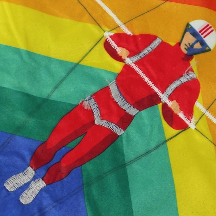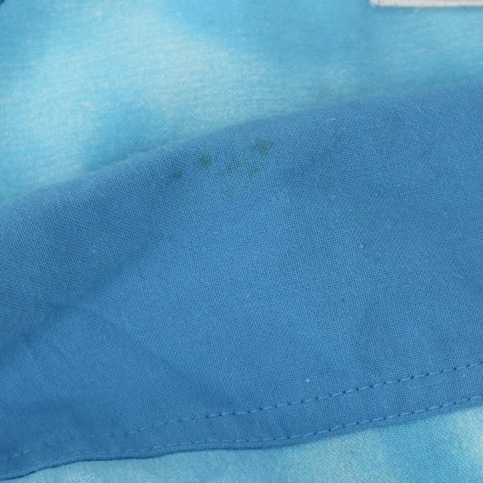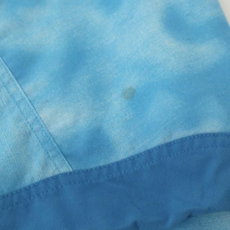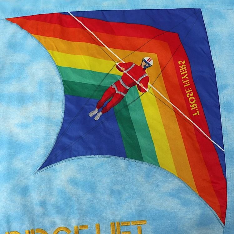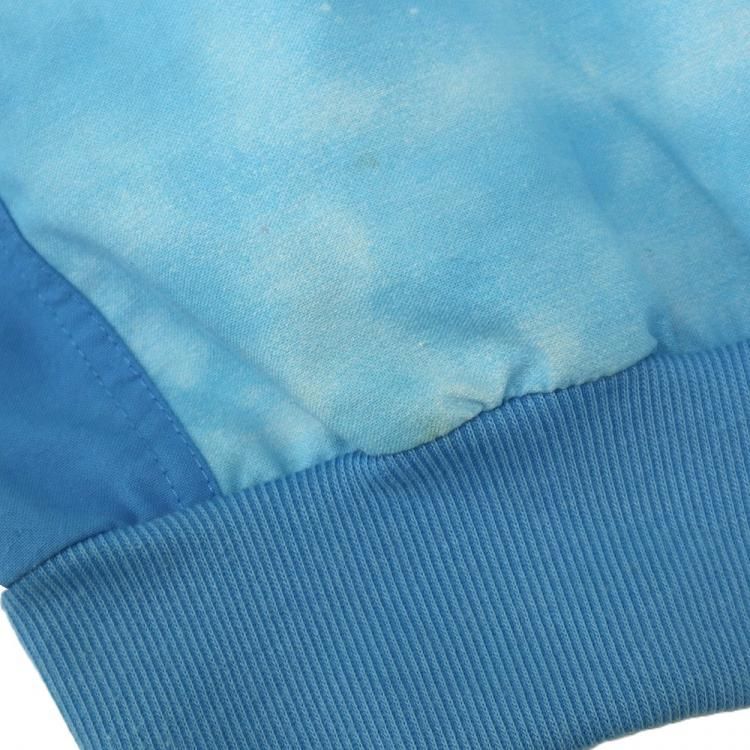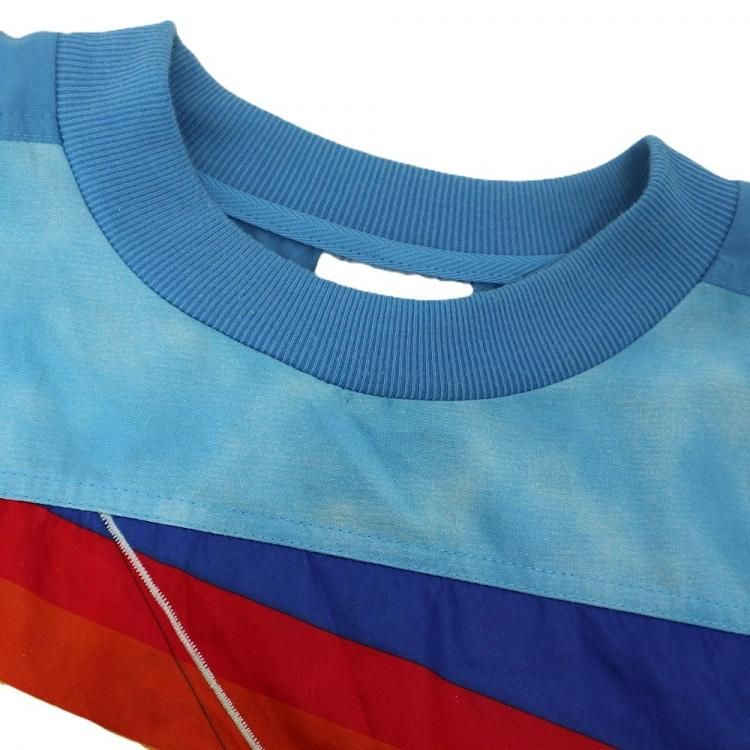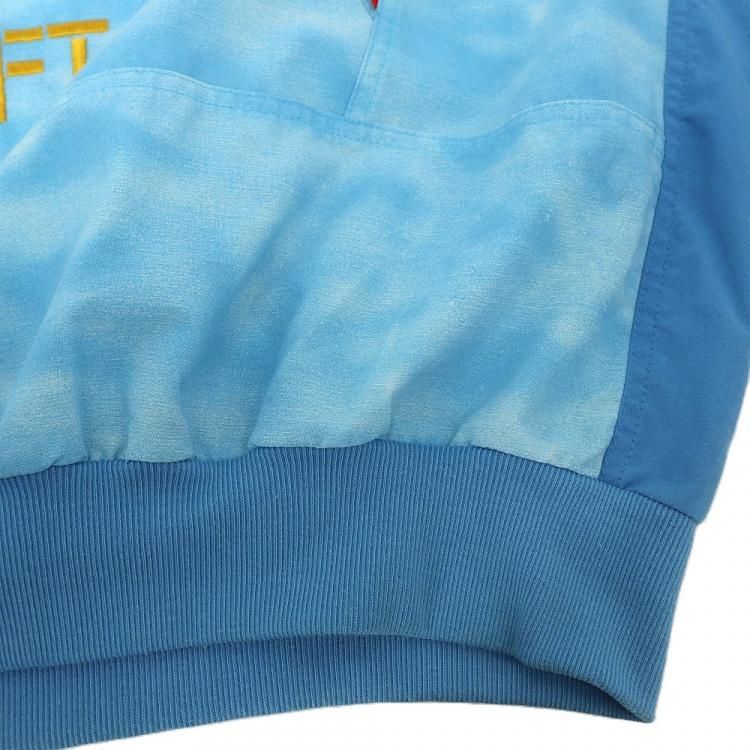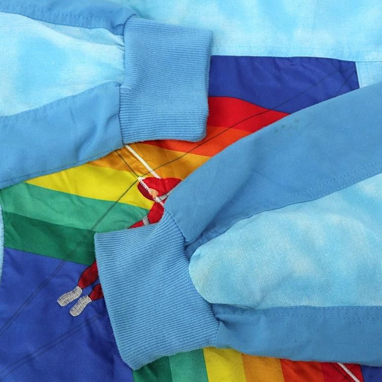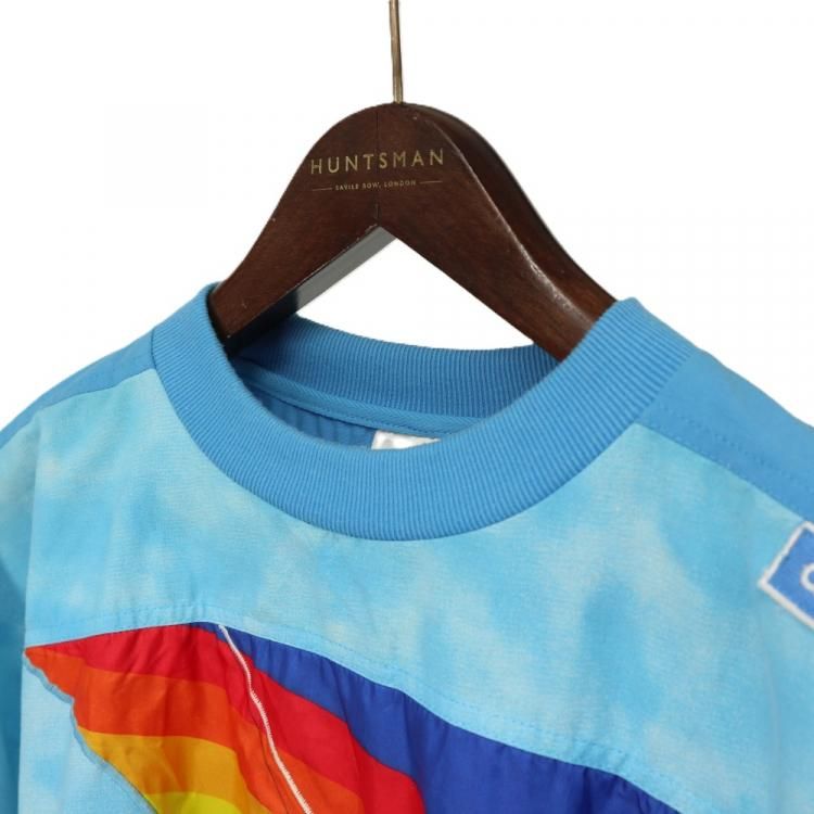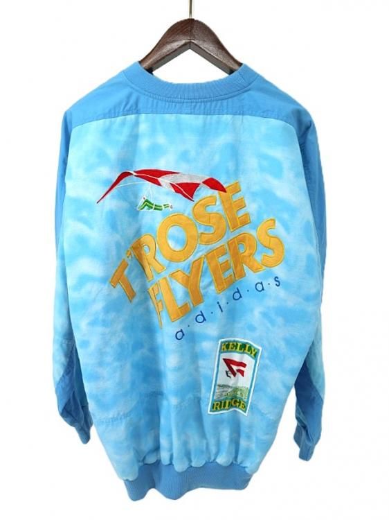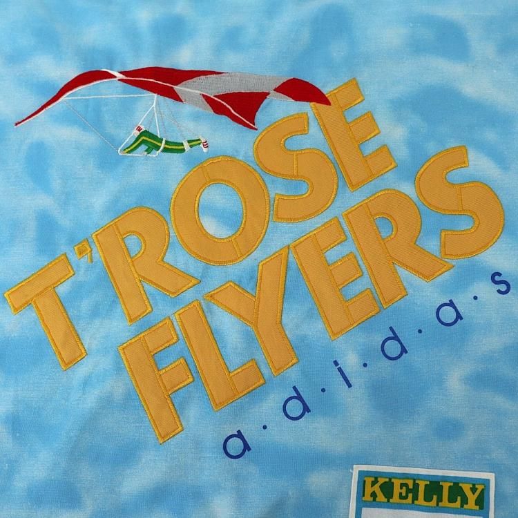 コメント:80年代 アディダス プルオーバー カットソーです。 こちらはプリントと刺繍で構成されたパラグライダーの絵柄が強烈なインパクトを放つフロント、バックはまるでポスターの様な構図でパラグライダーとT'ROSE FLYERSの文字は刺繍で表現。 タイダイの様なムラがある水色が青空なのでしょう。 画像では伝えきれない複雑な切替しが多数あり、かなり手の込んだアートピースと言えるアイテムです。