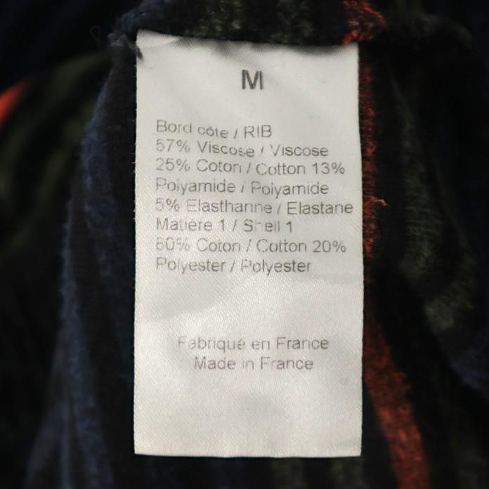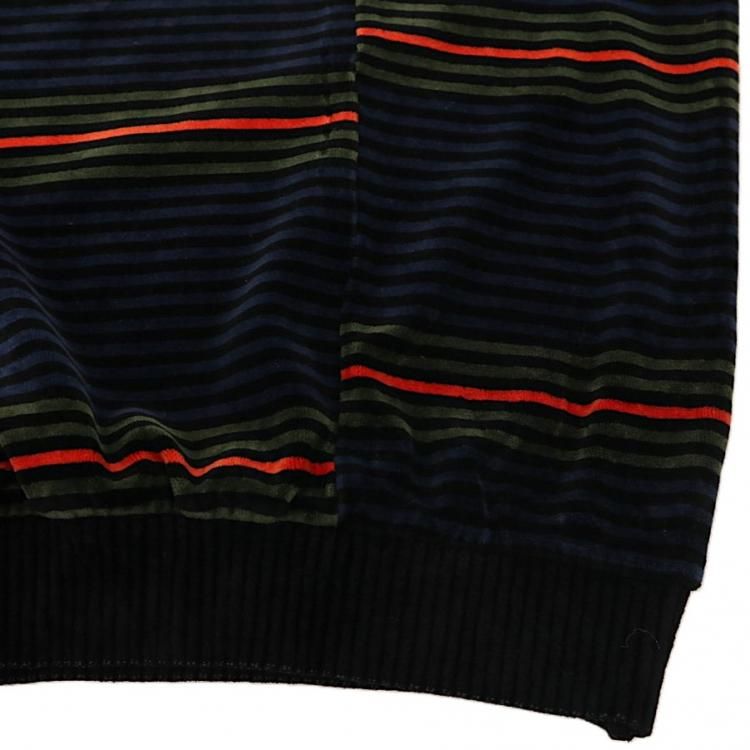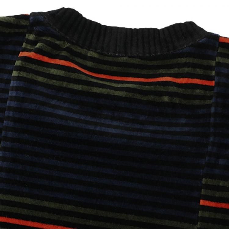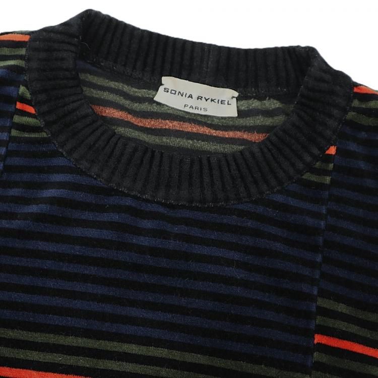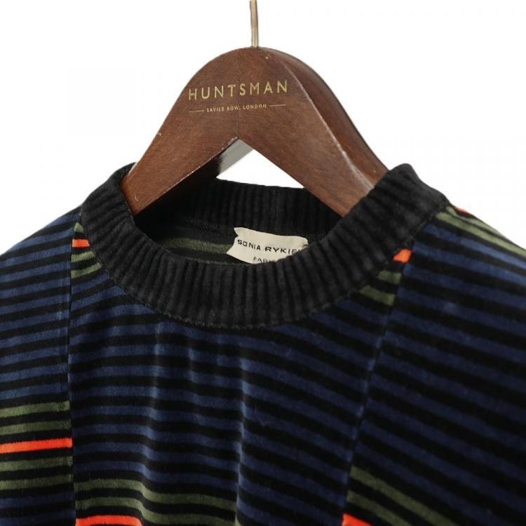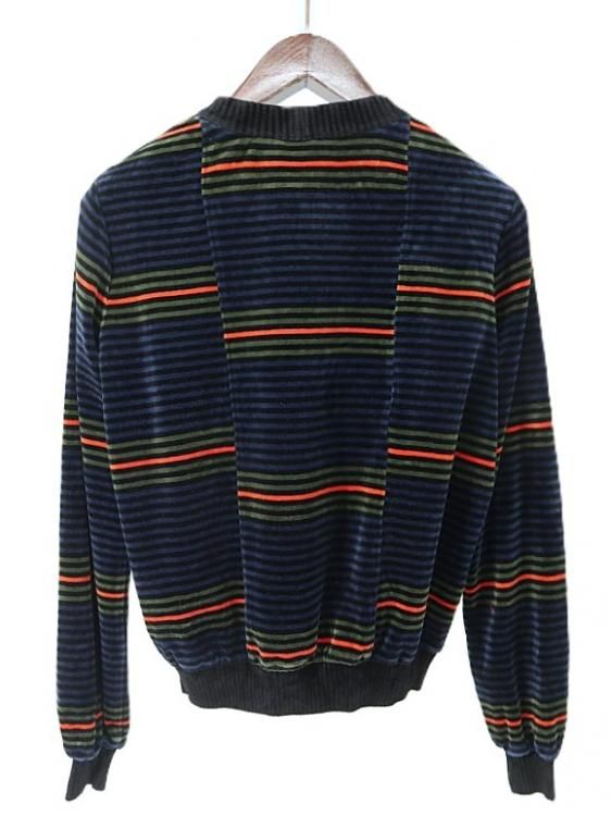 コメント:ニットの女王と称され今はなきブランド、ソニア・リキエルのカットソーです。 滑らかな肌触りのベロア生地にネイビー×ダークグリーン×オレンジのボーダー。 オレンジが効いてますね。 また生地をズラして切替えていますので動きがあります。 着丈が短いのでスカートにもパンツにも合わせやすいのではないでしょうか。 秋冬にピッタリのアイテムです。