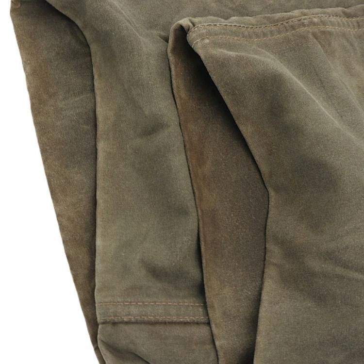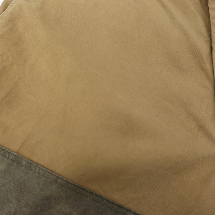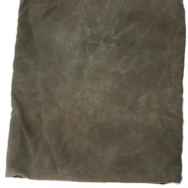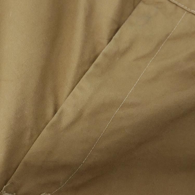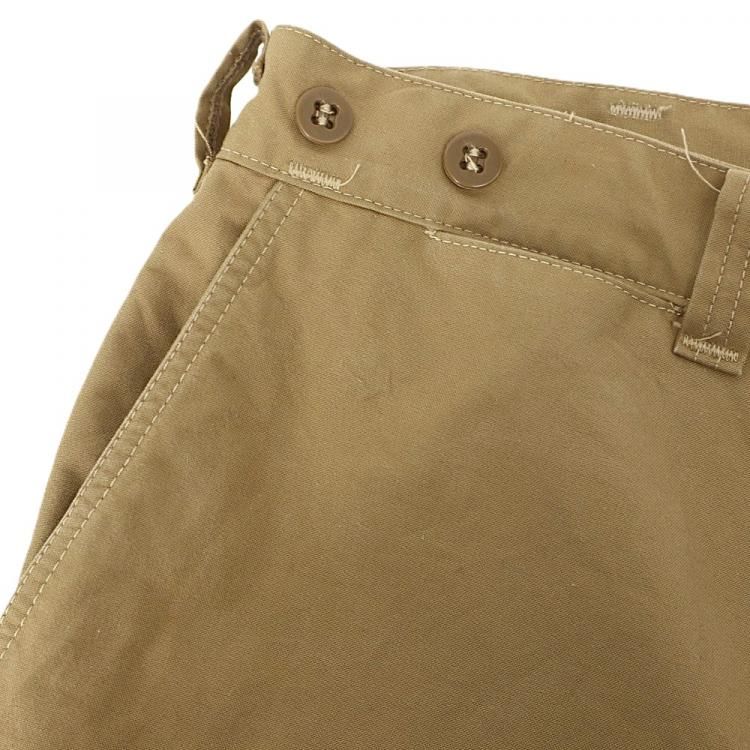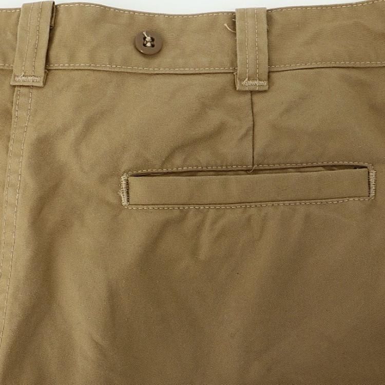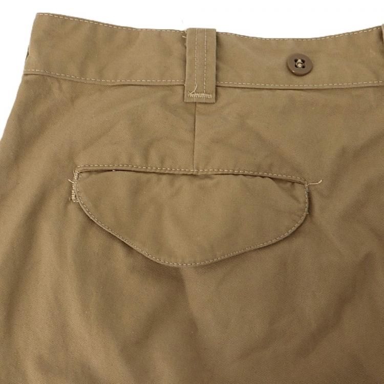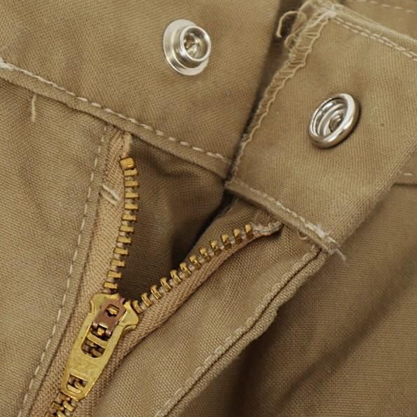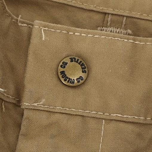コメント:2005年6月製造 フィルソン のハンティングパンツです。 ベージュ系カーキのキャンバス生地にグリーン掛かったグレーのオイル加工されたティンクロス生地を補強に、前面は腿から下にかけて、後ろ面はひざ下に貼られています。 ウエストにはサスペンダーボタンを装備。 庭いじりや何か作業される時にも重宝するパンツです。