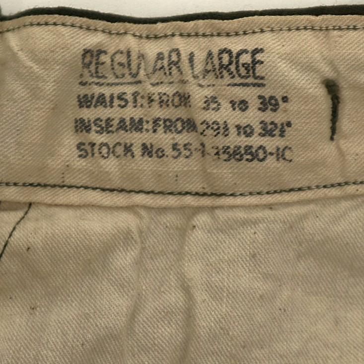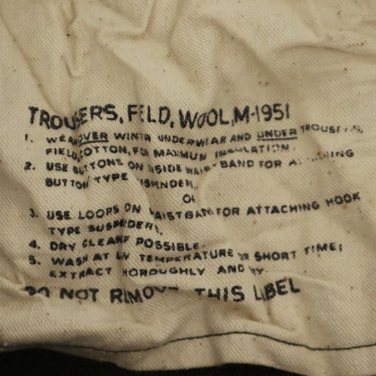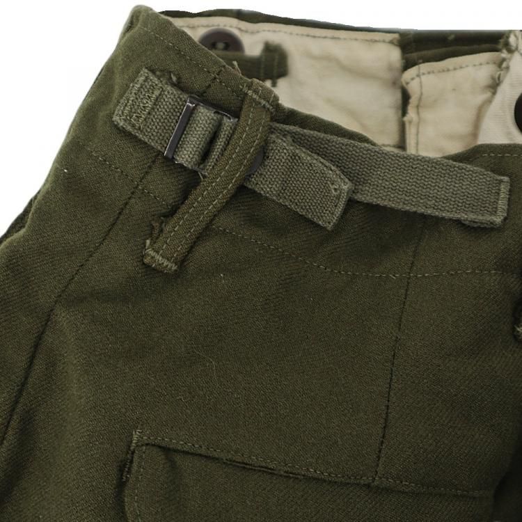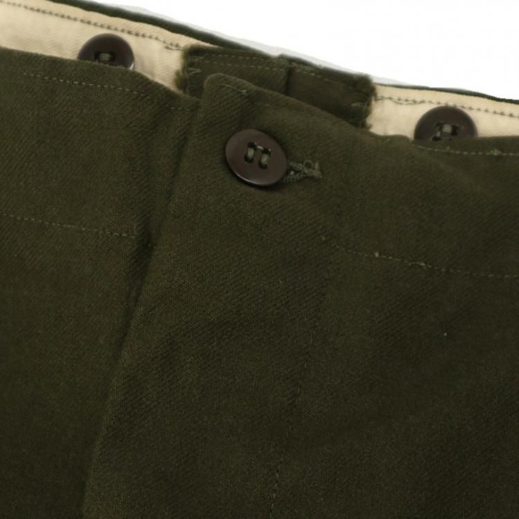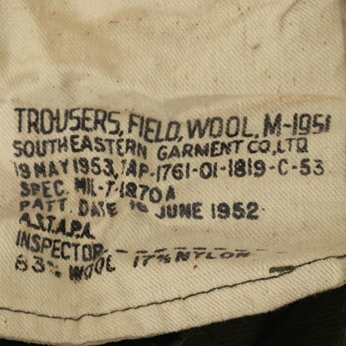 コメント:53年コントラクト 朝鮮戦争時に使用された 米軍実物 M51ウールパンツです。 サスペンダー用も含めボタンは全て平ボタン、RAPID ジップ使用で、厚手のウール生地の冬用になります。 ウール生地ですがFIELD TROUSERS なので野戦用となり、質実剛健と言った言葉が相応しいパンツになります。