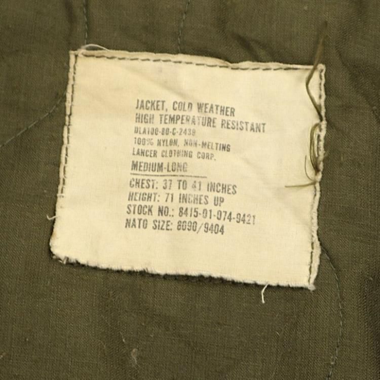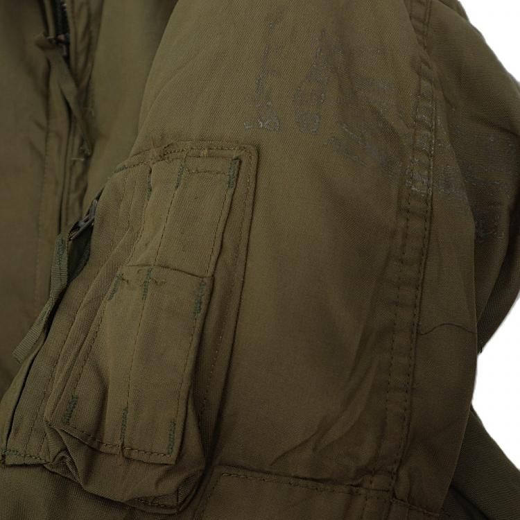 コメント:80年コントラクト JACKET, COLD WEATHER HIGH TEMPERATURE RESISTANT。 いわゆるタンカースジャケットです。  耐熱性、難燃性を備えたノーメックスで作られたこちらのブルゾンは、機能だけではなく短丈のアウターとしては他のミリタリーウェアの中でも普段に取り入れやすいデザインとなっています。 しかもこちらはロング丈になりますので、よりバランスの良い個体です。 街中ではあまり見かけないブルゾンなので、変わり種を探されている方には選択肢の1つになっても良いのではないでしょうか。