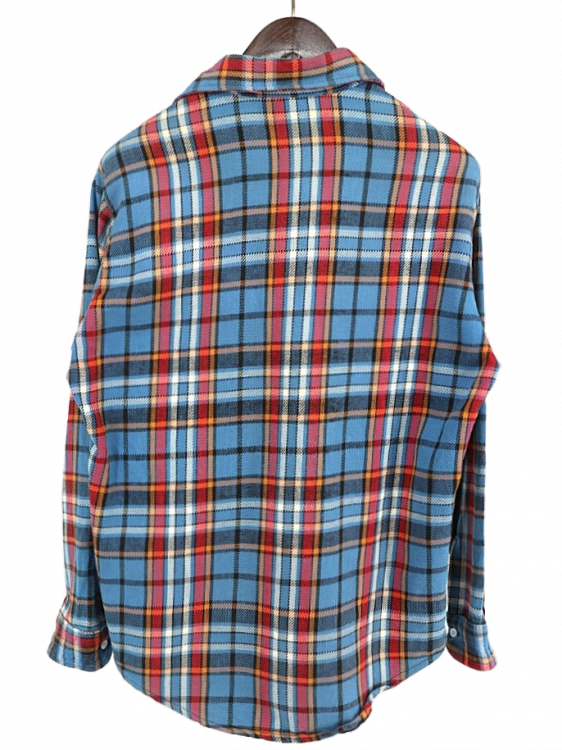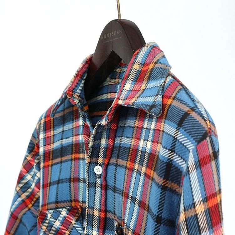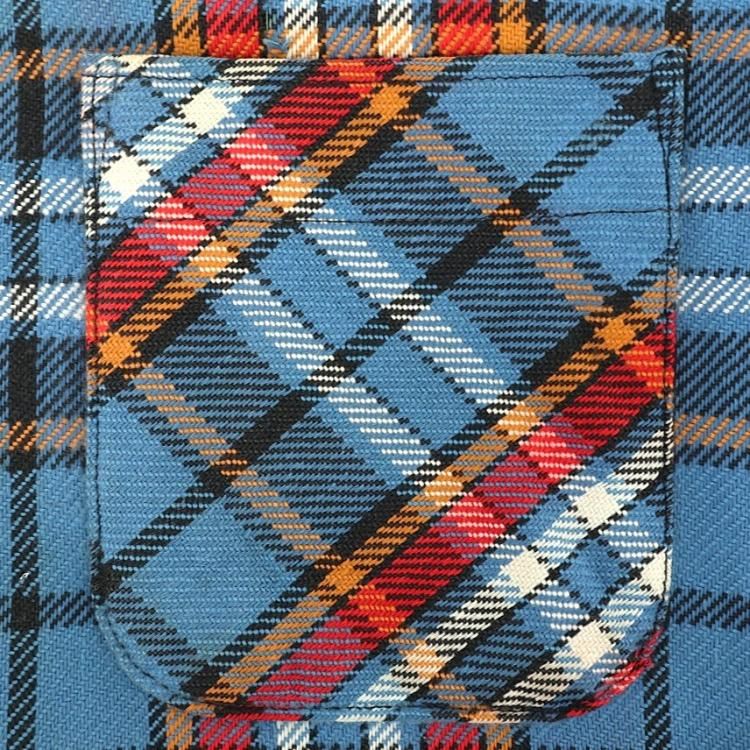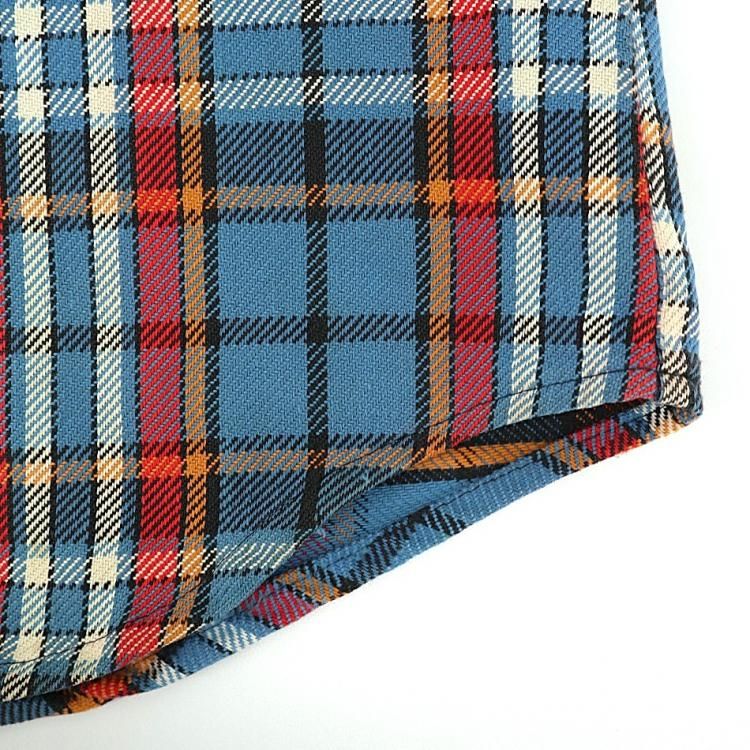 コメント:70年代ヴィンテージのBIG MAC ヘビーネルシャツです。 言わずと知れたアメリカ三大ストアブランドの1つジェーシーペニーのプライベートブランド。 ブルー×レッド×オレンジのチェックが古き良きアメリカをイメージさせますね。 重めなブラック レザーパンツやデニムベストなどバイカーファッションにもハマりそうなシャツです。