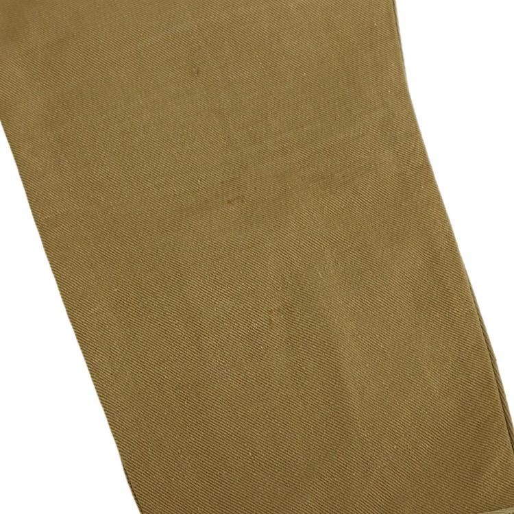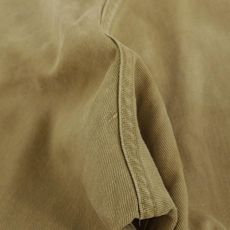 後ろ左ポケットボタンに取れかけとフロントボタン1番下に付け替え、左ポケット内側に破れ、ウエスト部分内側にシミ、所々に小さな汚れとシミと若干の糸引きがあります。