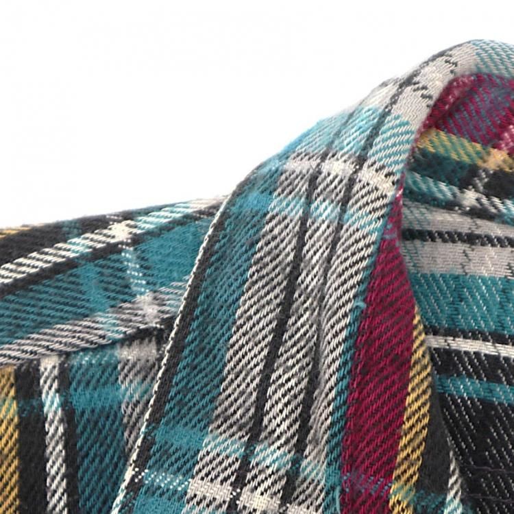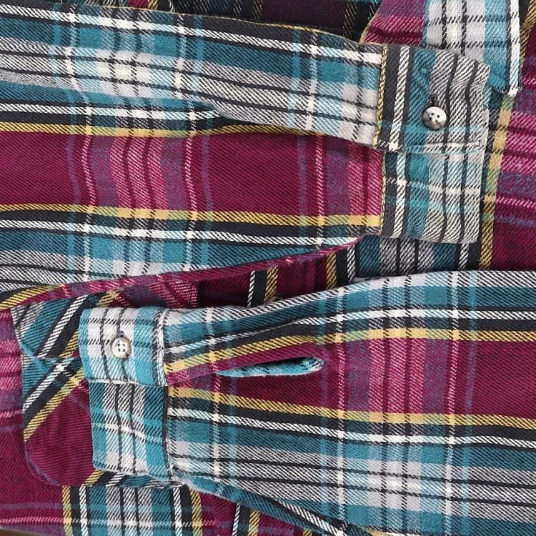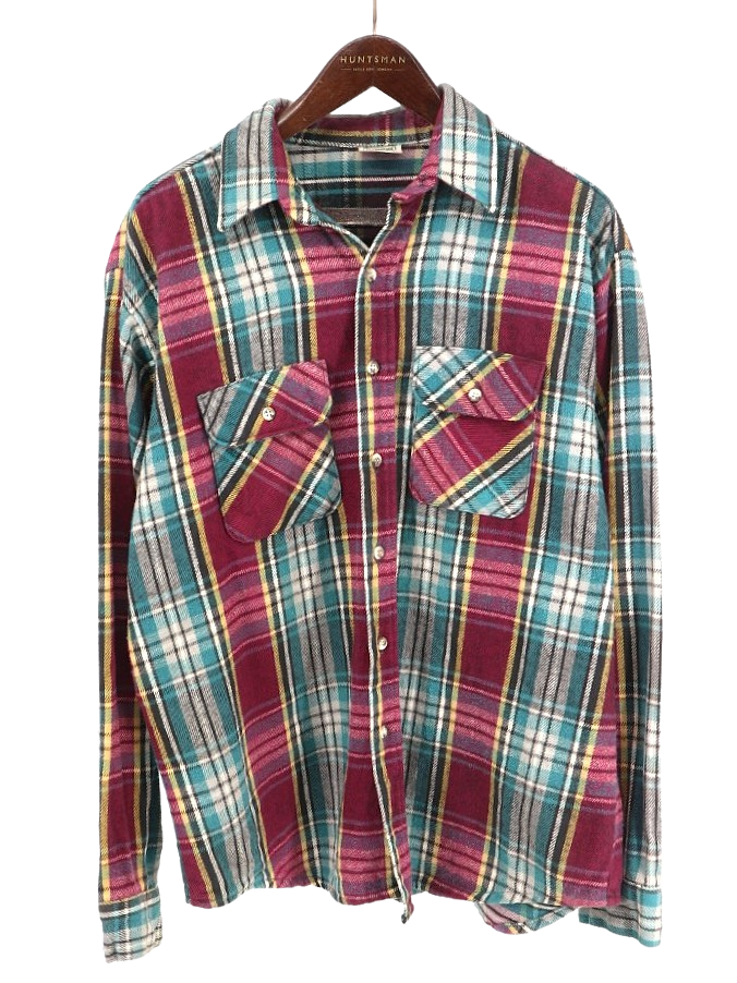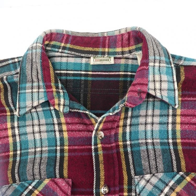 コメント:90年代 FIVE BROTHER の ネルシャツです。 ネルシャツと言えばのファイブブラザー で、老舗のワークウェアブランドですね。 こちらはボルドー×ターコイズブルーにイエローが利いたチェックで、アメカジらしい色合い。 ボルドーがストライプ状に入っているのもちょっと変わってて面白いです。 襟芯入り。