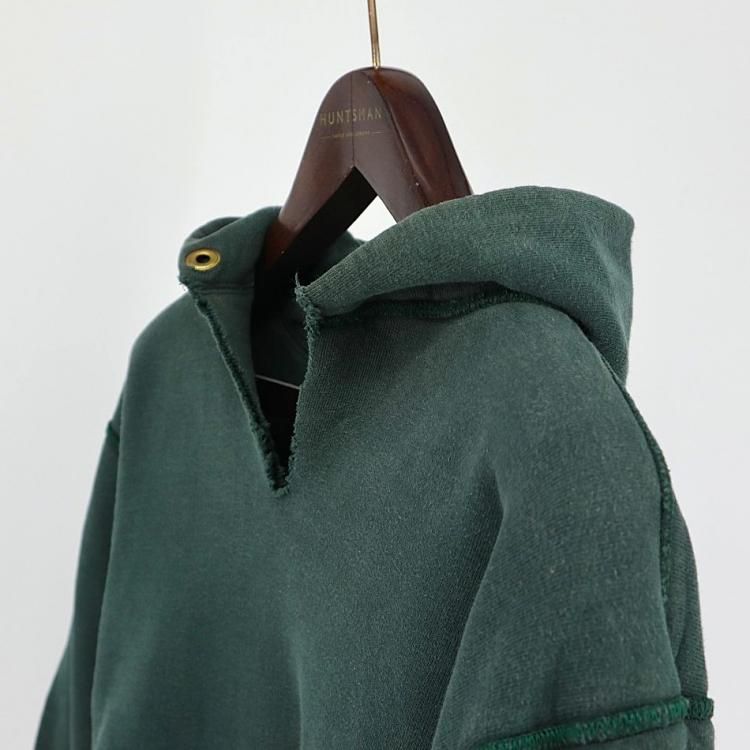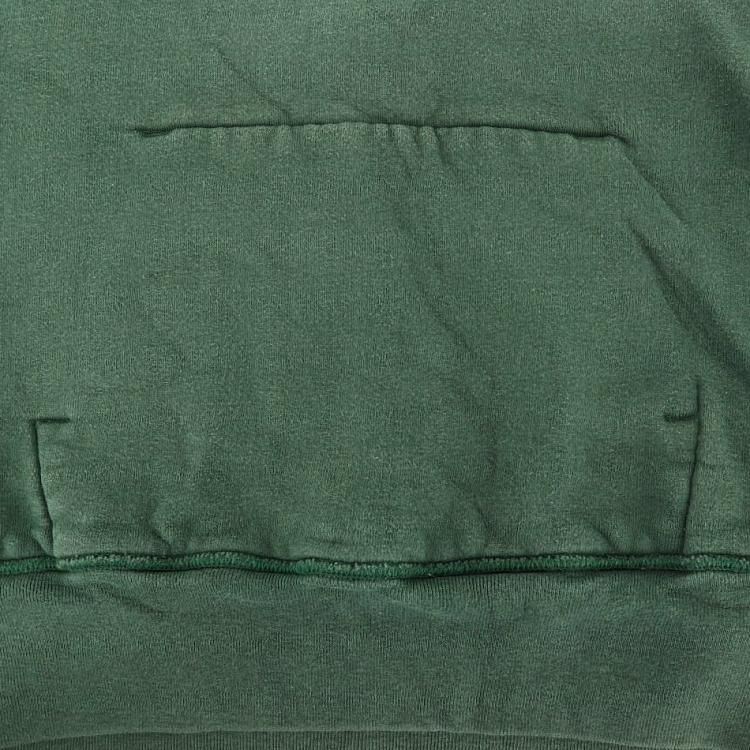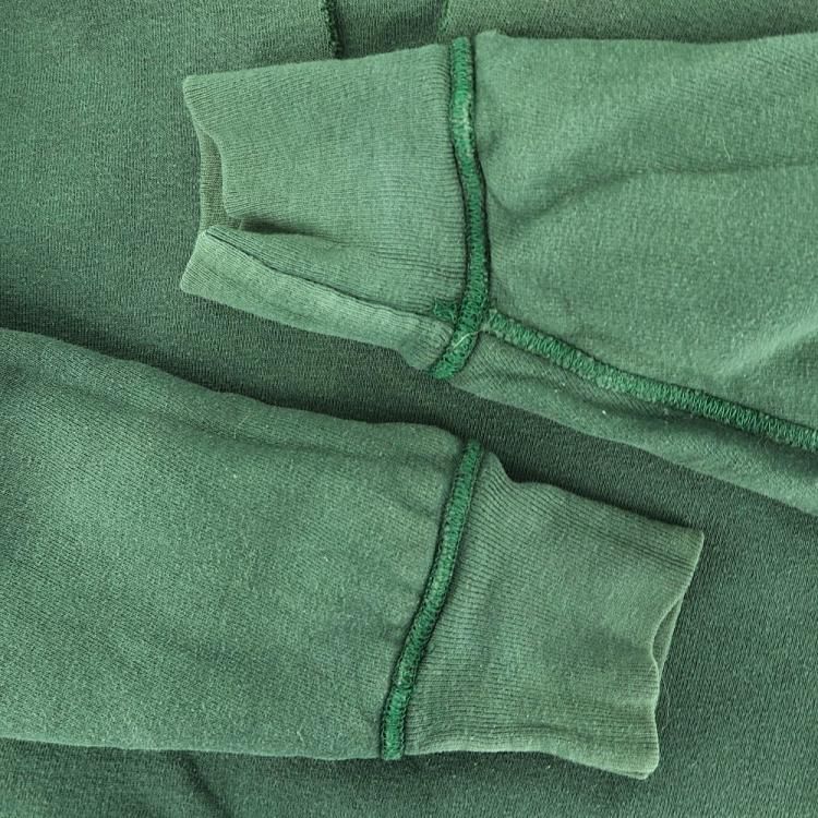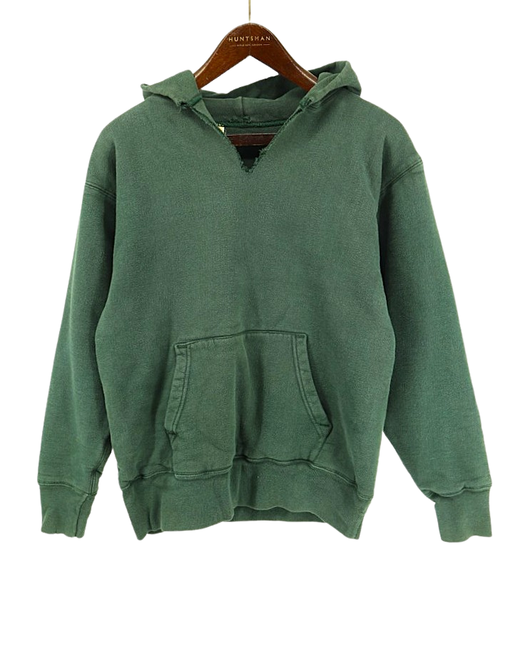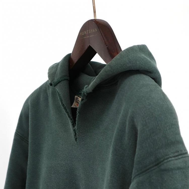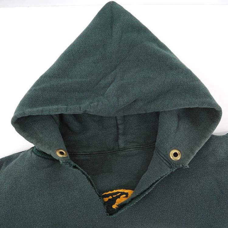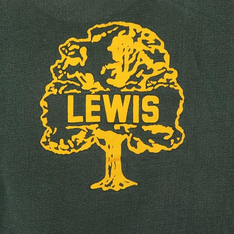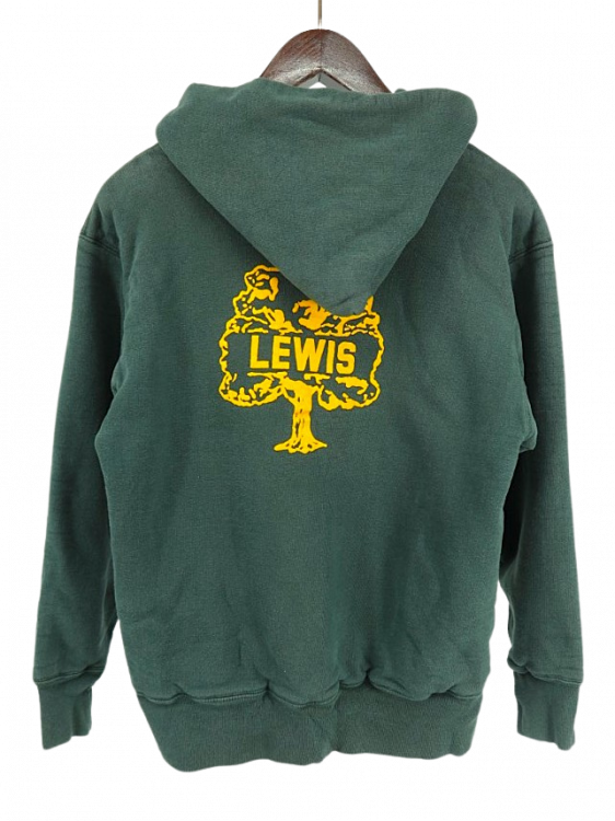 コメント:80年代Champion社製 Wフェイスのスエットフーディーです。 ダブルフェイスはここ数年人気が高まっていますが元々出現率が低く、フーディーになると極端に下がります。 こちらフロントは無地で袖にも目がない完全目無し。 バックに LEWIS のロゴでグリーンのボディからおそらくフォートルイス大学になるかと思います。 ダブルフェイスのフーディーに旧ハトメの目無し、サイズの合う方が羨ましい。