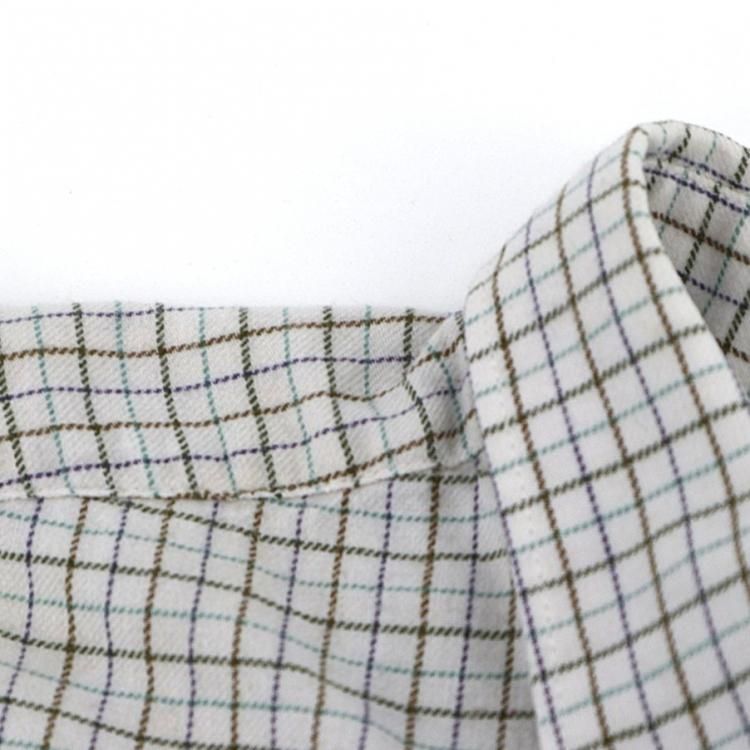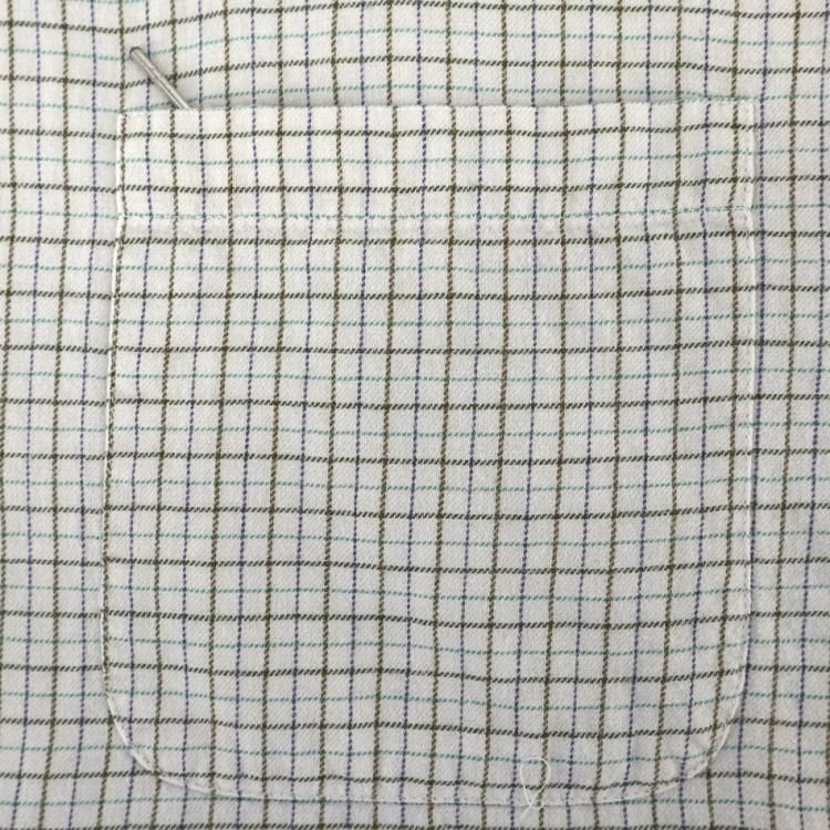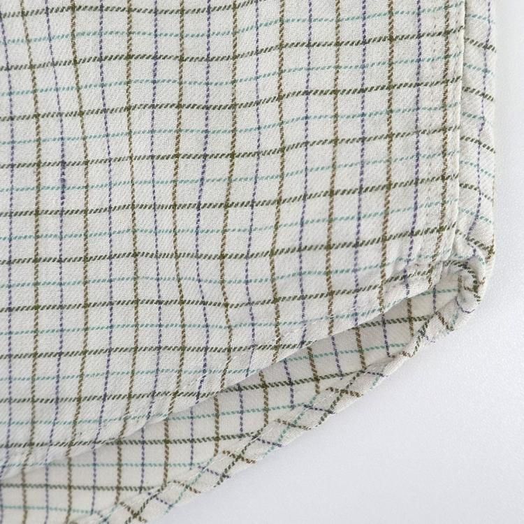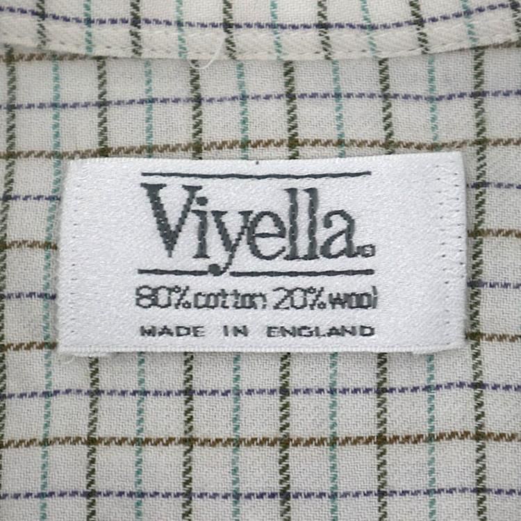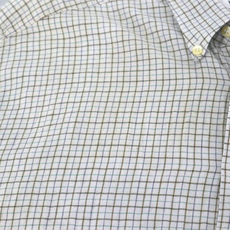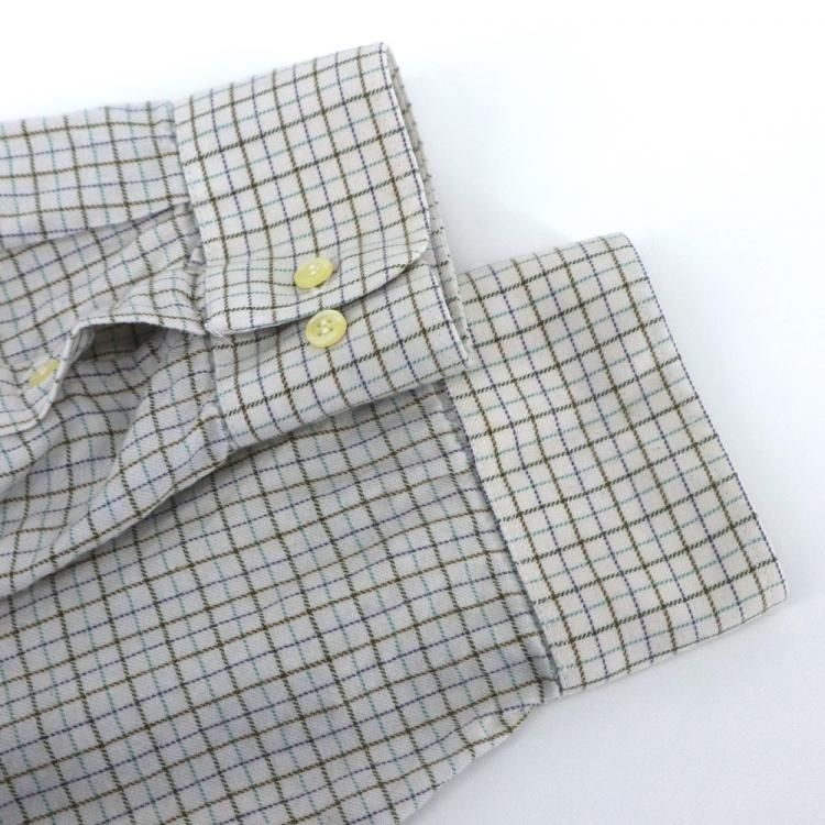 コメント:ウィリアムホリンズ社の綿と毛の混紡糸を綾織りにして起毛させた生地を使用したビエラのシャツです。 ビエラ生地の特徴より、薄手で柔らかい肌触りになっています。 たとえハイゲージニットの中に着用してもあまり形が出なさそうな生地感です。 ダークグリーン×オリーブ×ブルー×スモーキーブルーのチェックは英国トラッドな印象を受けるので、アランニットやツイードジャケット等との相性は良さそうです。