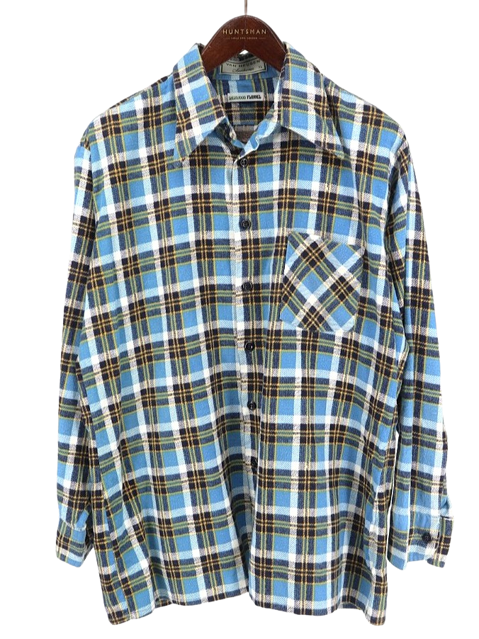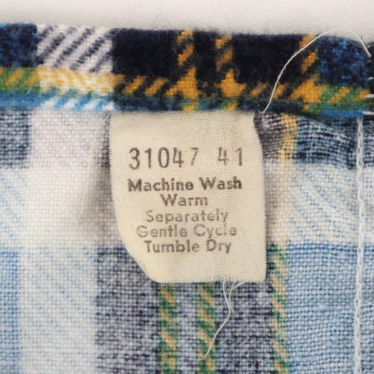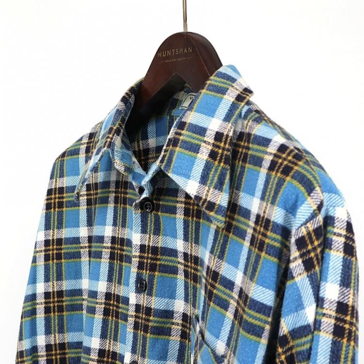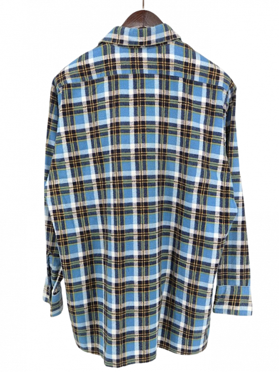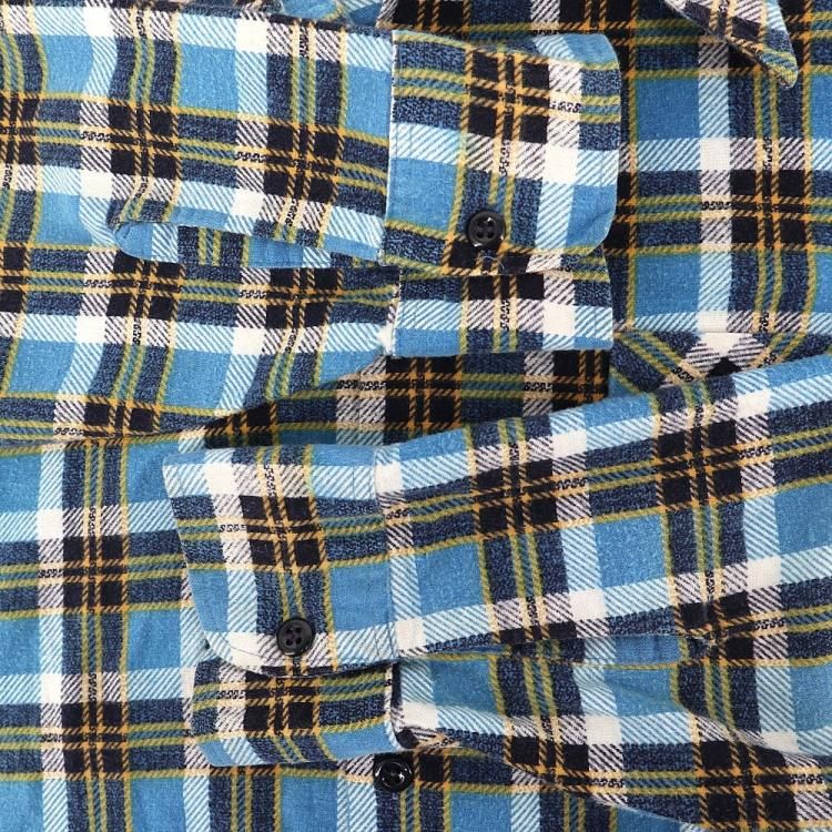 コメント:おそらく70~80年代あたりのヴィンテージ ヴァンヒューゼンのネルシャツです。 ここら辺の年代に多い大きな襟が特徴的なネルシャツ。 ボックスカットなので裾出ししても収まりが良いです。 ブルー×ネイビー×イエローの色合いが爽やかな印象。 ライトネルなので夏を除いて3シーズン着用できます。 襟芯入り。