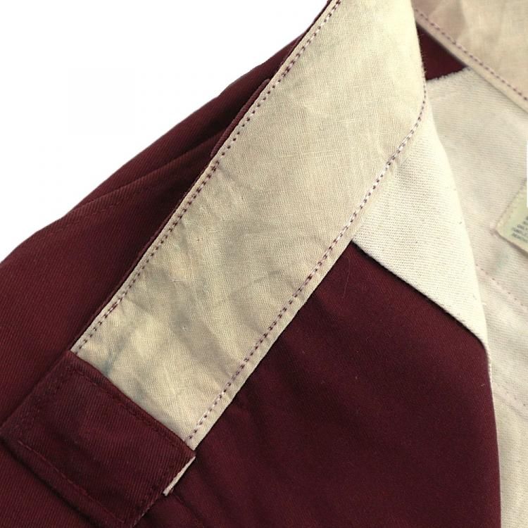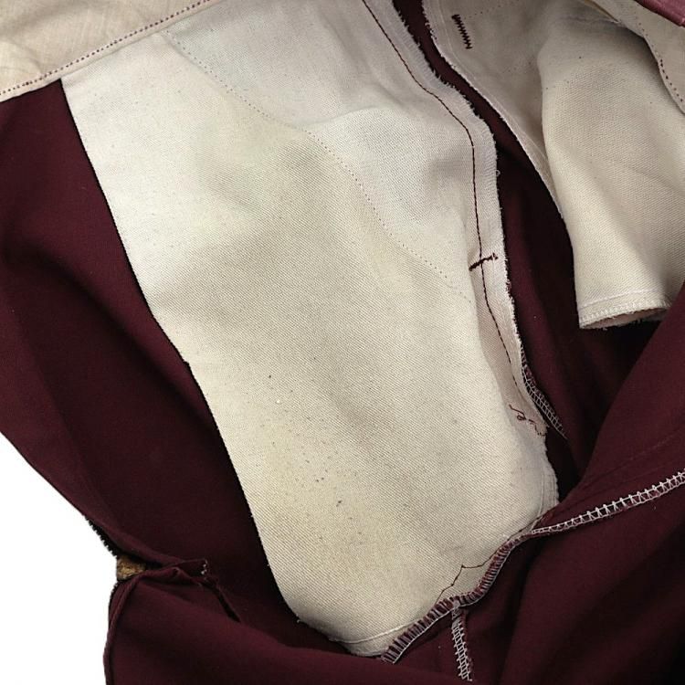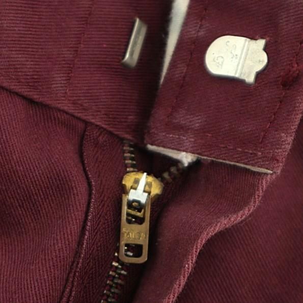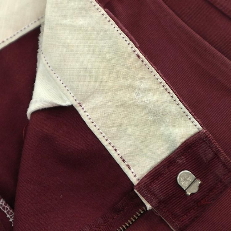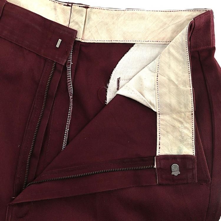 コメント:80年代頃のウエスト調節縫い代付き USA製Dickiesのワークパンツです。 チビタグは欠損しています。 TALONのセミオートマチックジッパー使用。 色はマルーンになります。