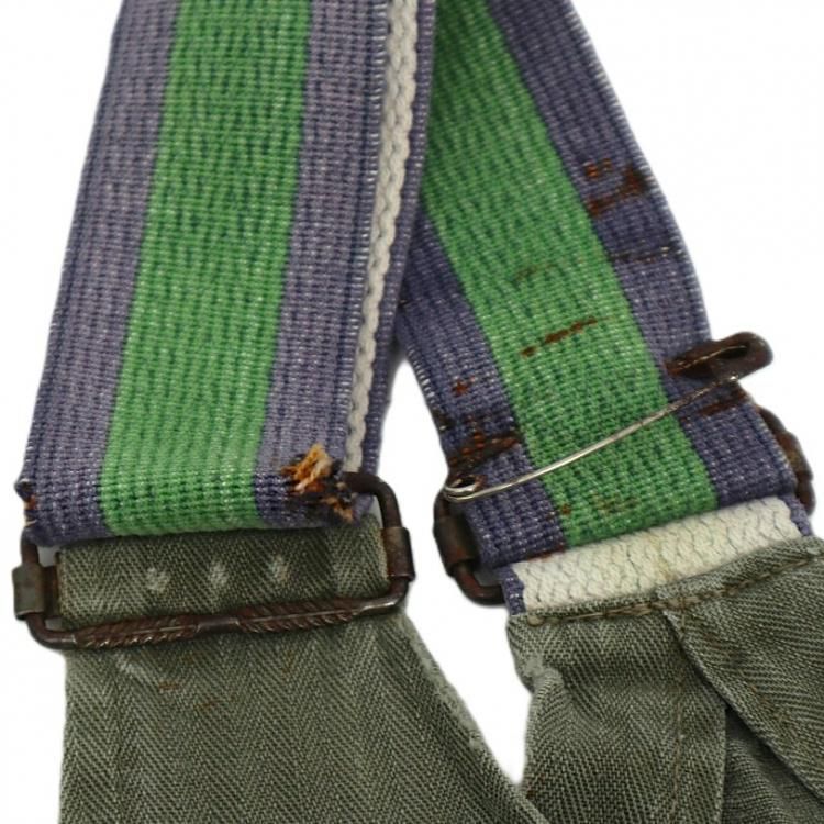 全体的に使用感と金具にサビ、股下にほつれ、所々に小さなシミと軽いダメージがあります。