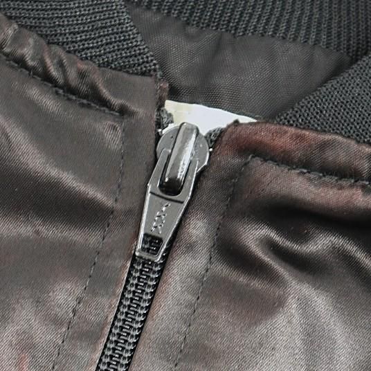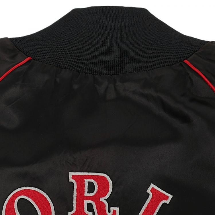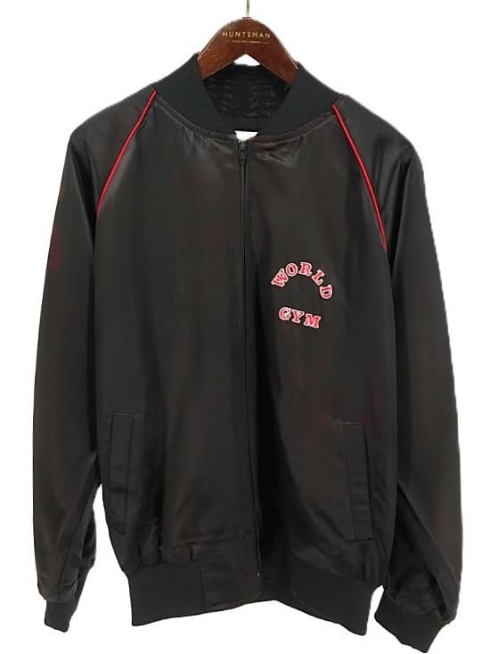 コメント:80~90年代のワールドジムのブルゾンです。 アーノルドシュワルツェネッガーも70年代に通っていた老舗のジム。 実際にワールドジムのTシャツを着ている姿が確認できます。 こちらはベーシックなリブ ブルゾンですが、両面刺繍にレーヨンボディと豪華な造りになり、ブラック×レッドの定番ですがワルっぽい色合いもワールドジムに合っていると思います。