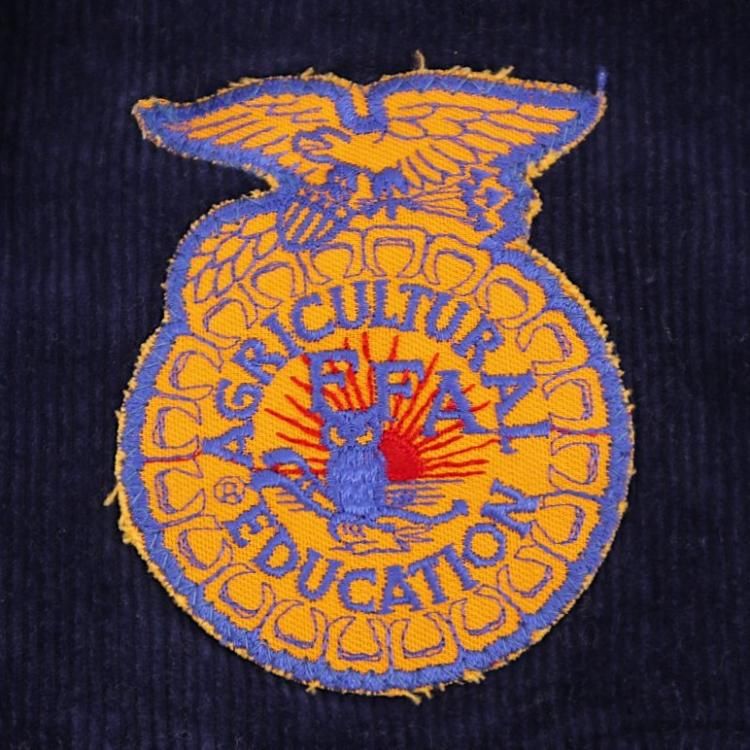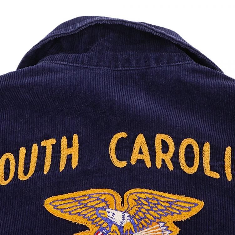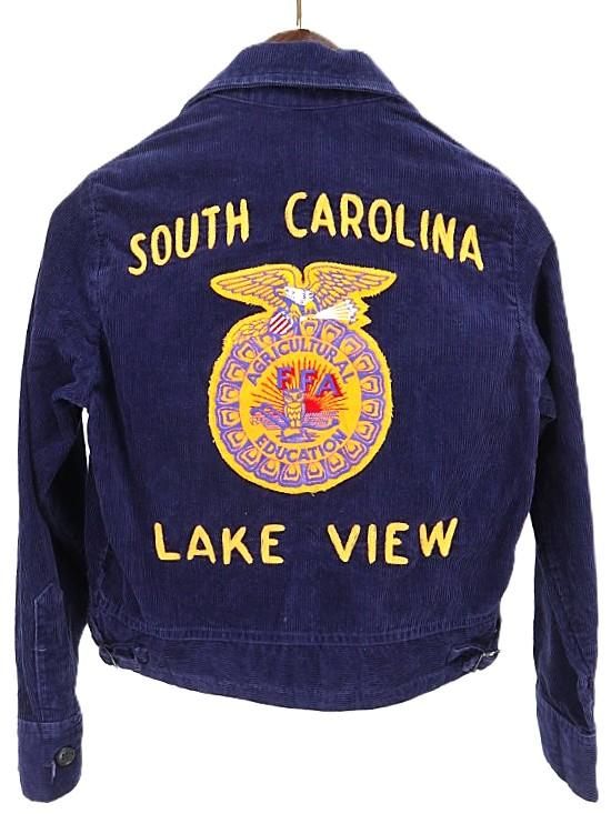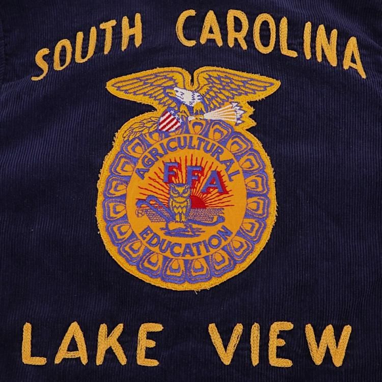 コメント:80年代あたりのFFAジャケットです。 ショート丈のドリズラーと言ったデザインのブルゾン。 深いネイビーのコーデュロイにイエローの刺繍やワッペンなどの装飾が鮮やかでカッコイイです。 胸に3段で入る名前に、バックの地名 サウスカロライナ レイク・ビューはチェーンステッチ刺繍になります。 YKKジップ使用。