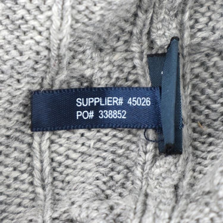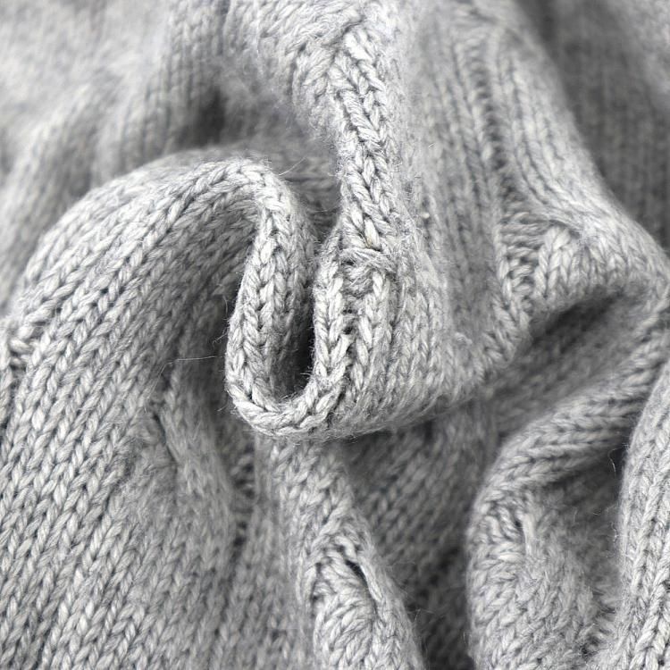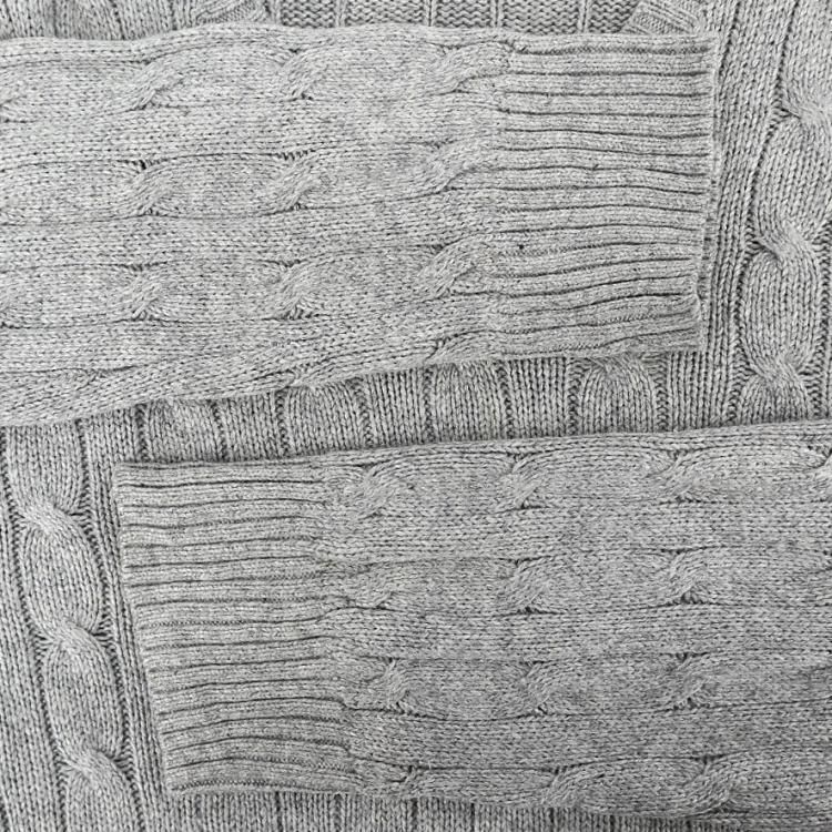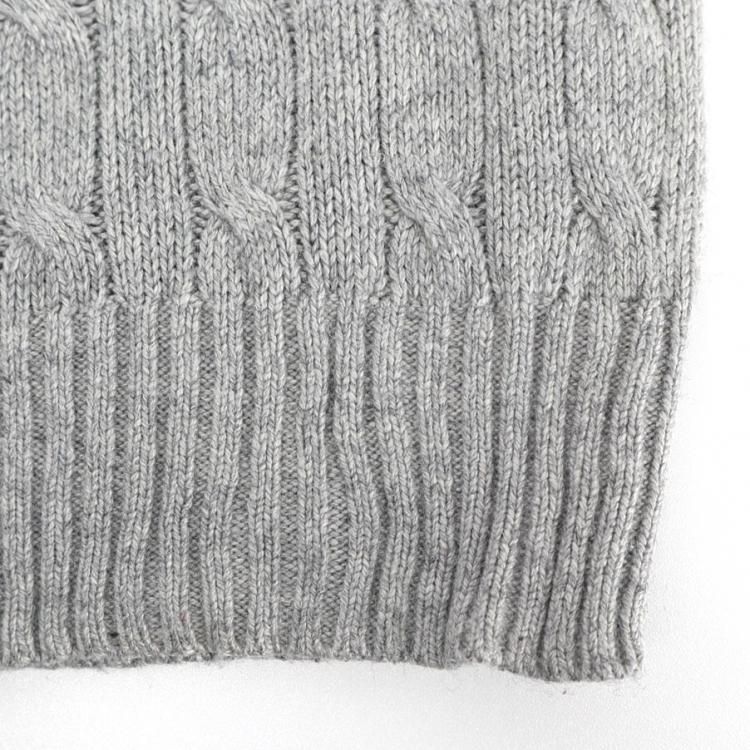 グレーのケーブル編みVネックだと汎用性は高いかと。