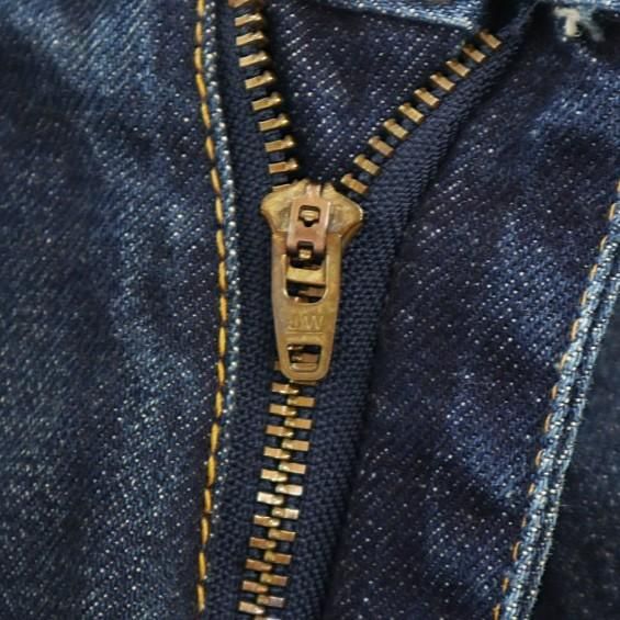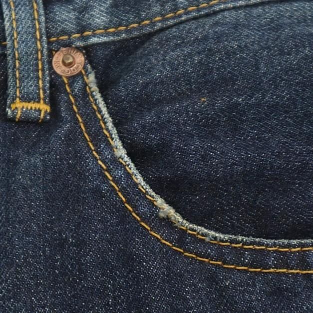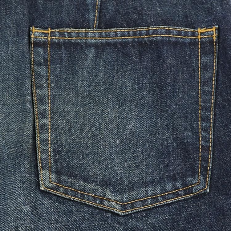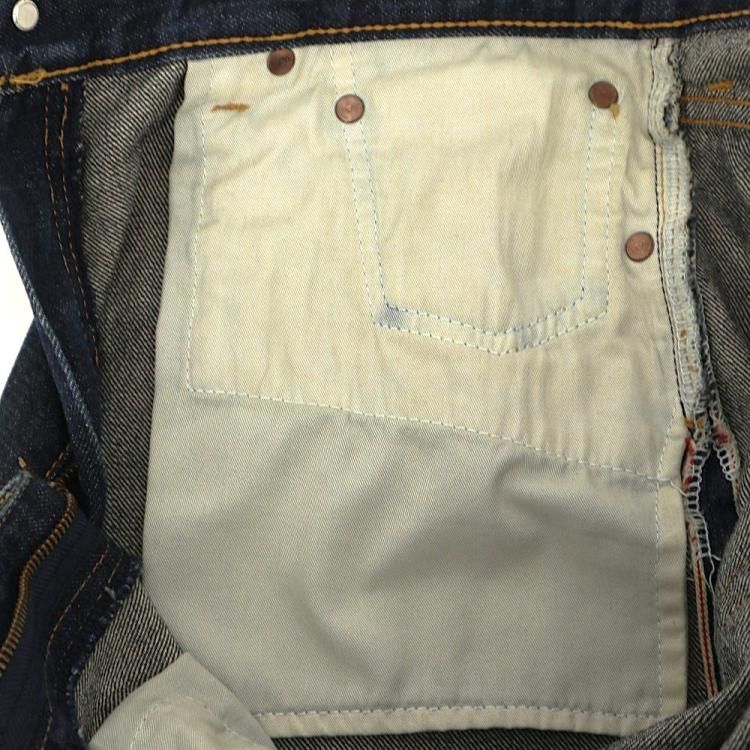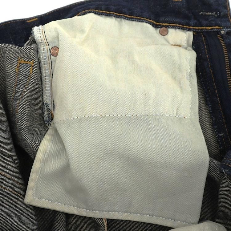 若干の使用感と色褪せ、内ポケットに色移り、後ろ革パッチに汚れ、フロント両ポケットと裾に軽いダメージがあります。
