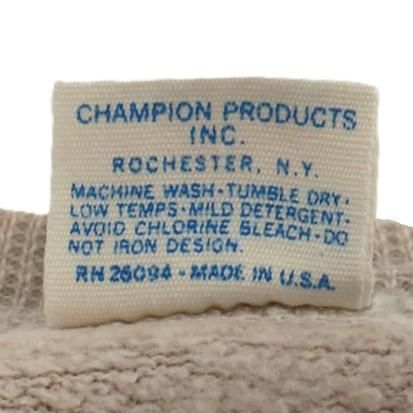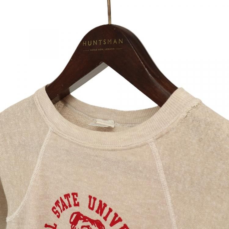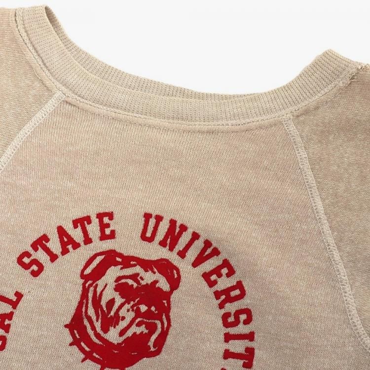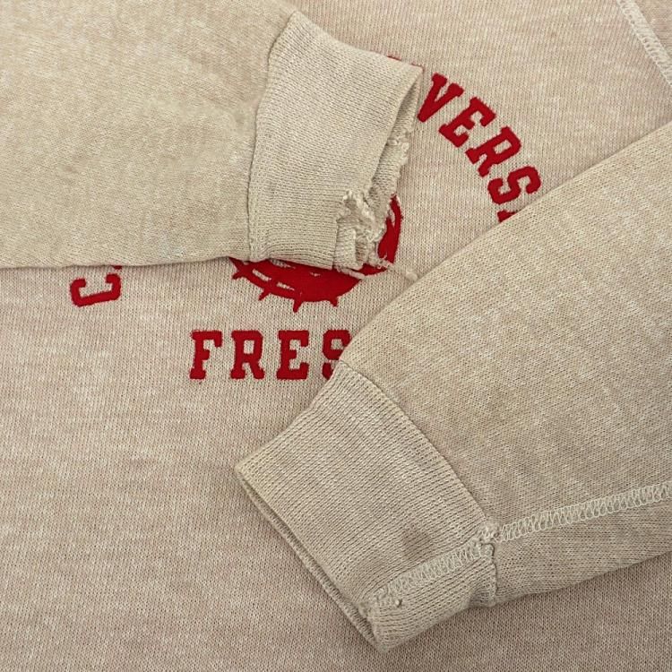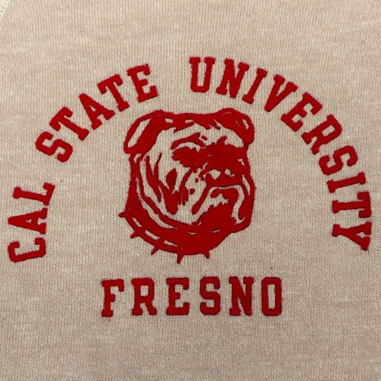 コメント:70年代のビンテージ Champion社製スエットトレーナーです。 NYヤンキースのジャッジ選手の母校でもあるカリフォルニア州立大学フレズノ校のスポーツチームの物で、ブルドッグのプリントが特徴です。 ブラウン杢ボディに赤のプリント。 ブルドッグがとってもかわいいです。