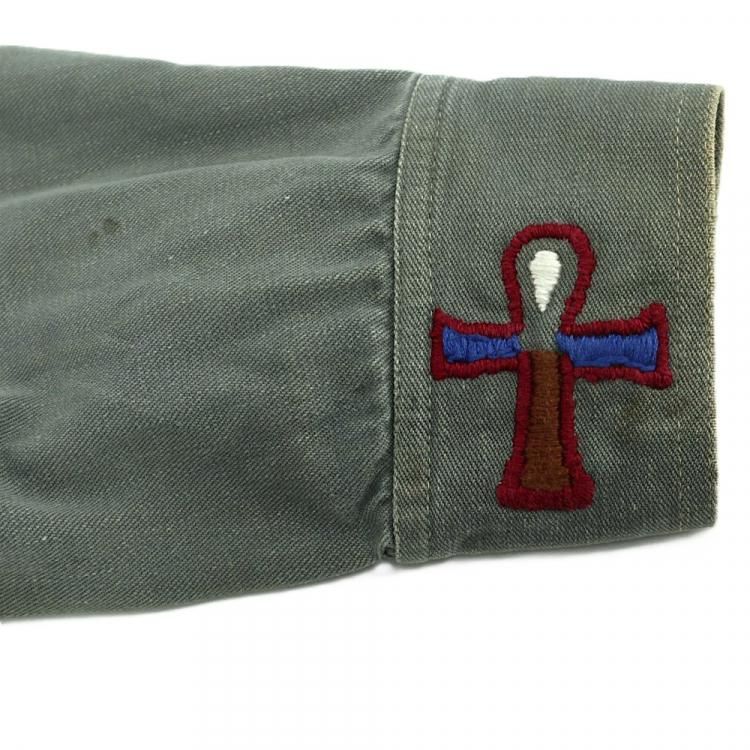 セージグリーンで比翼ボタンが特徴です。 左袖カフスにお守りや魔除け意味があるアンククロスの刺繍入り。
