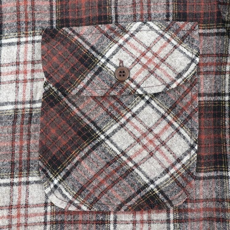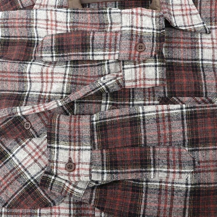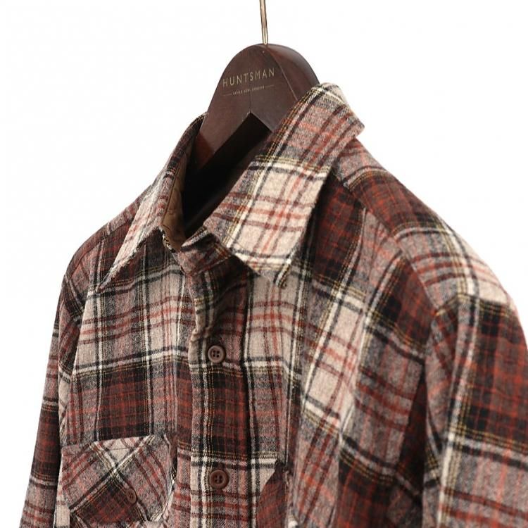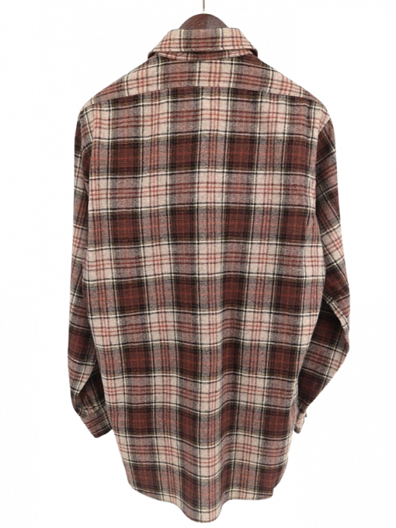 コメント:70年代ヴィンテージPENDLETONのウールシャツです。 フラップ付きの2ポケットにブラウン系のチェック柄。 ウールだと暖かみがあって上品な印象を受けますね。