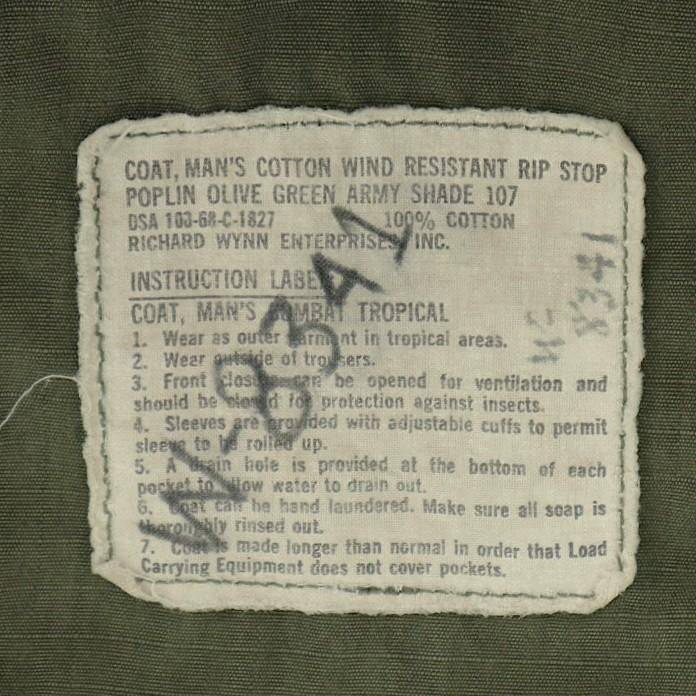 コメント:68年コントラクト ヴィンテージ COAT, MAN'S COTTON WIND RESISTANT RIP-STOP POPLIN OLIVE GREEN ARMY SHADE 107 です。 通称ジャングル ファティーグ ジャケット。 リップストップ生地で袖にマチが付く 4th モデル。
