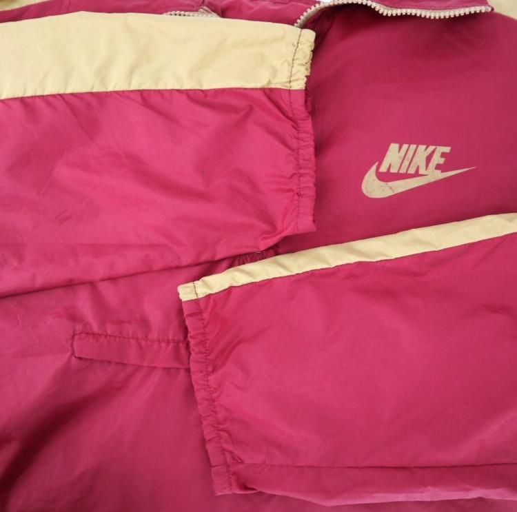 コメント:70年代のヴィンテージ ナイキのナイロン プルオーバーです。  ハーフジップでスタンドカラーになる定番の形。 メインはロケットタロンで、カンガルーポケットは涙タロンのジップを使用。 大きな背ロゴがインパクトありますね。 黄土色に光沢があってゴールドの様なラインとエンジのボディが落ち着いた色味で大人な方が着ても違和感がなさそうです。 アメリカ製で大きいサイズなのも嬉しいポイント。