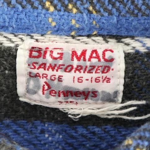 コメント:60年代ヴィンテージのBIG MAC ヘビーネルシャツです。 言わずと知れたアメリカ三大ストアブランドの1つジェーシーペニーのプライベートブランド。 ブルー×ブラック×イエローの好配色。 この年代になると一気に出現率が下がり、年々高騰しています。