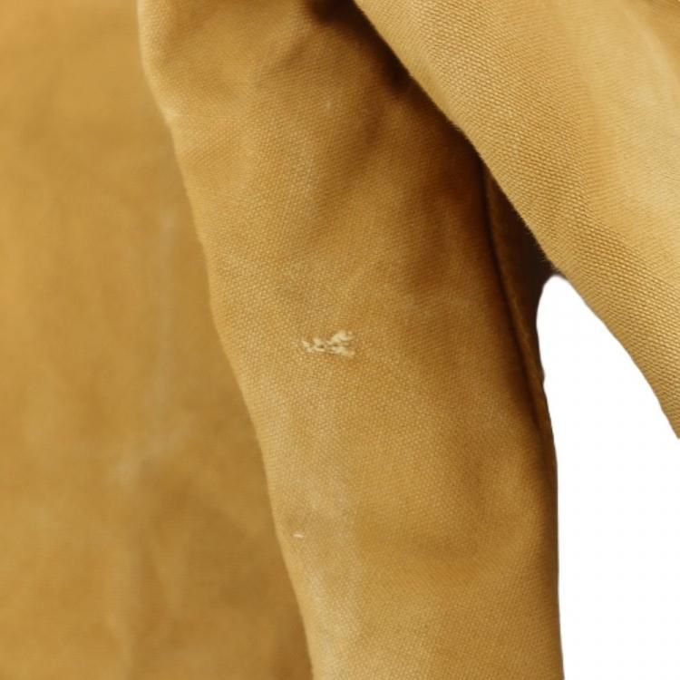 全体的に使用感と色褪せ、左足太もも付近内側に軽いダメージ、右足裾リブに1cm弱の小穴、所々にシミがあります。
