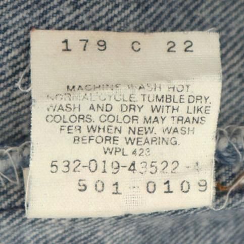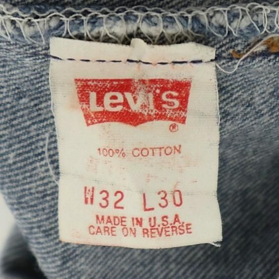 コメント:89年1月製 リーバイス501のジーパンです。 ハチマルのかなりハード目なケミカルウォッシュ加工。 ある一定の人気はありますが、なかなかイイ個体に巡り会えないのがこのケミカルウォッシュ物。 こちらは嬉しい501で、サイズもゴールデンサイズと言えますね。 程度も悪くなく、条件はかなりイイはずです。 裾の処理がシングルステッチですが、実寸やアタリから見てオリジナルレングスだと思われます。 ボタン裏532。