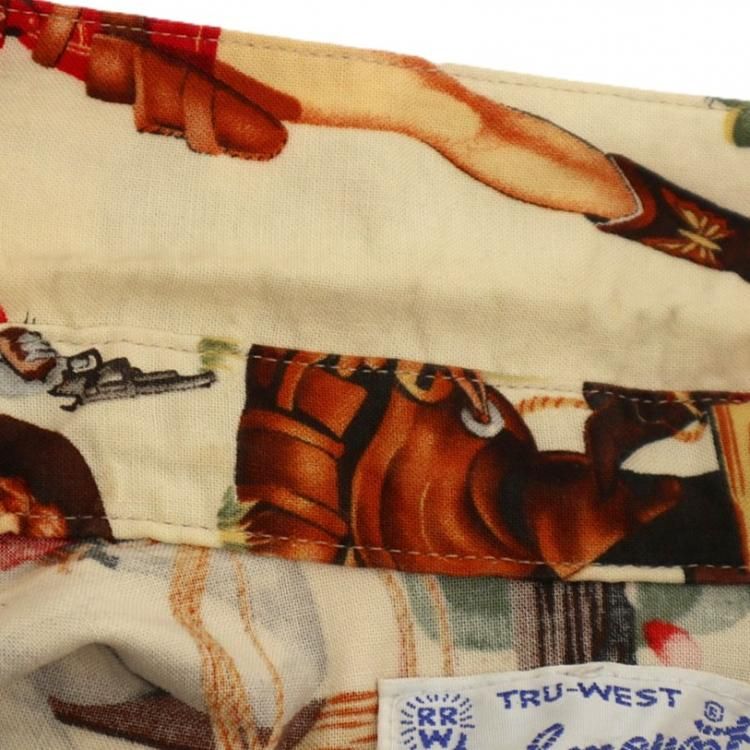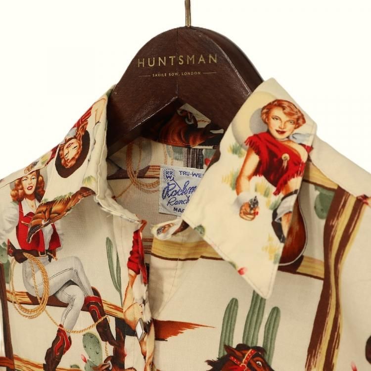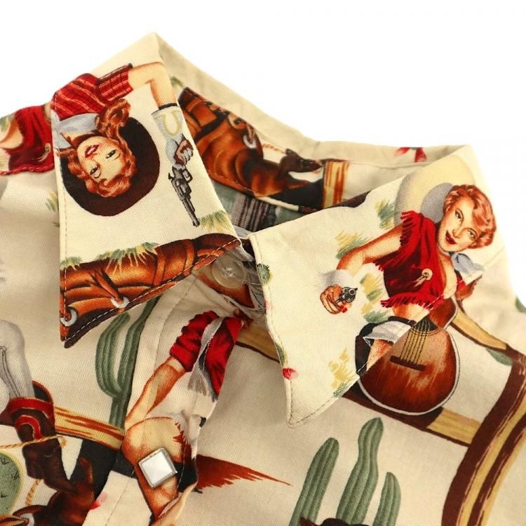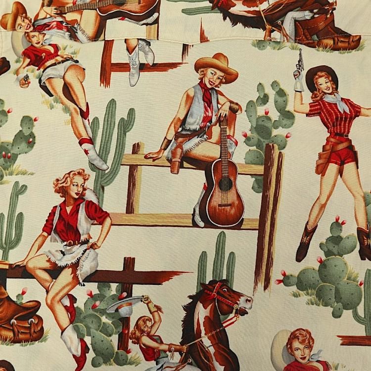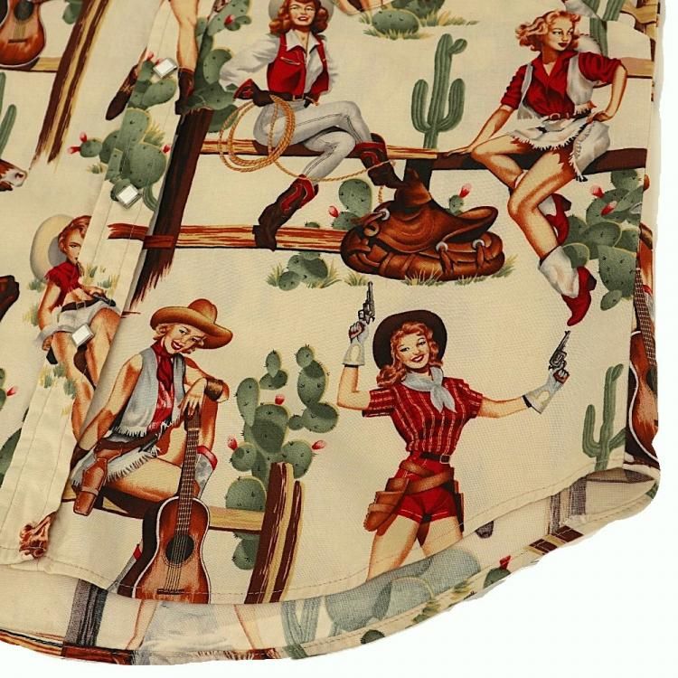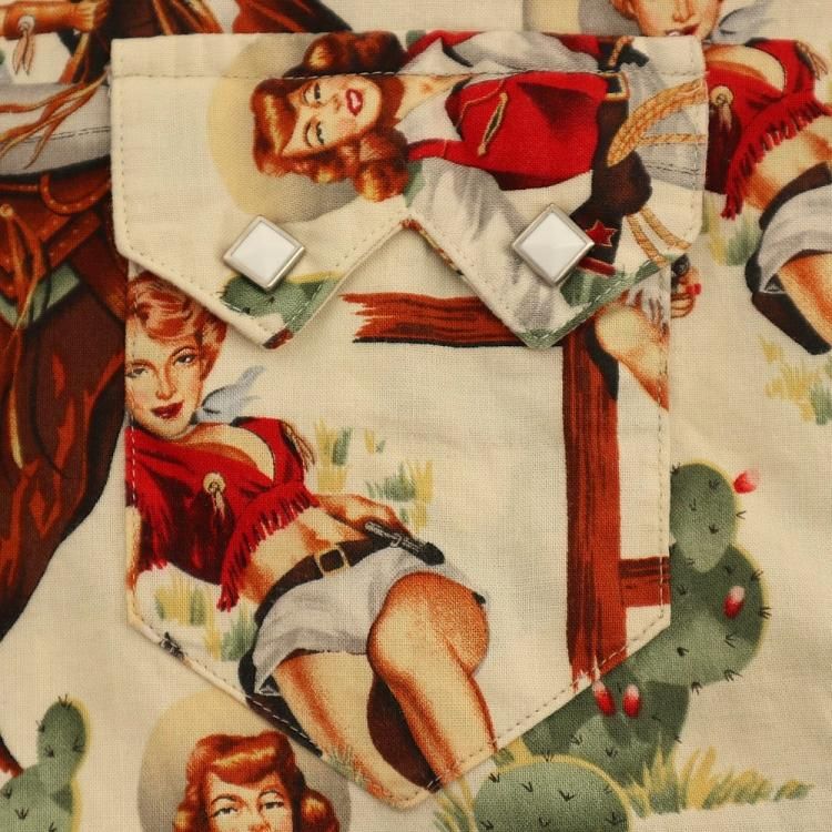 コメント:ロックマウントのウエスタンシャツです。 ピンナップガール風のカウガールが可愛いプリント。 ウエスタンのアイテムでコーディネートするのもよし、普段着としてジーンズなんかと合わせるもよし。