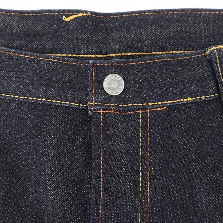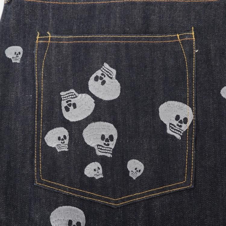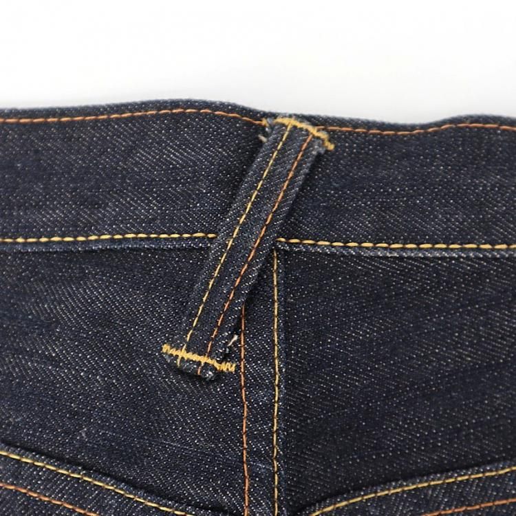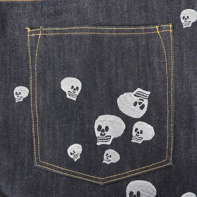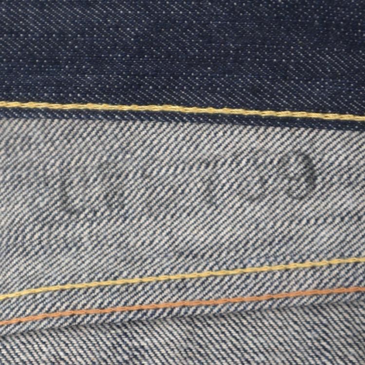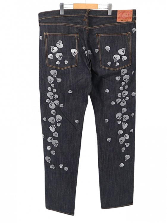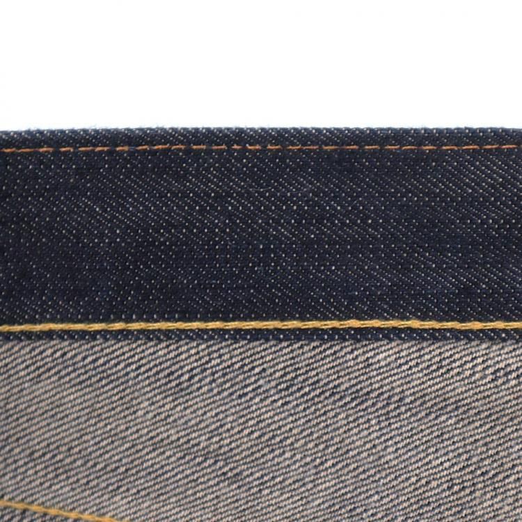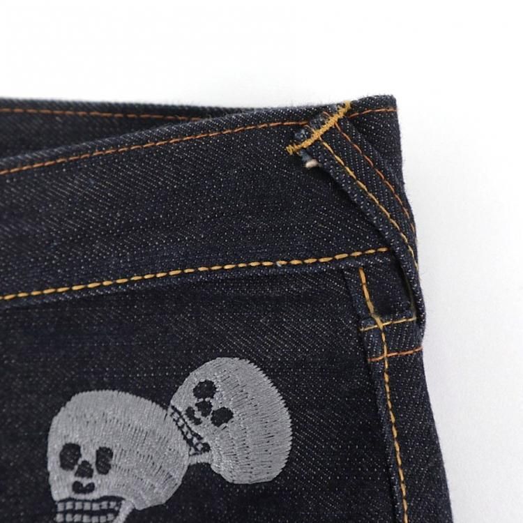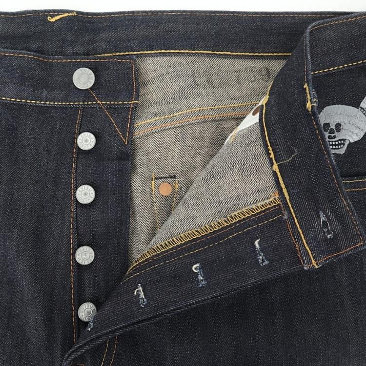 コメント:エヴィスのジーンズです。 リーバイスの501XXをモデルに隠しリベットやオフセットベルトループ等のディテールのジーパンンに、50年代スカジャンの髑髏刺繍で大黒マークを表現した遊び心のあるモデルになります。 股下リベットあり、リベットは打ち抜き、サイドのミミは緑と黒。 良い色落ちが期待でるデニムです。