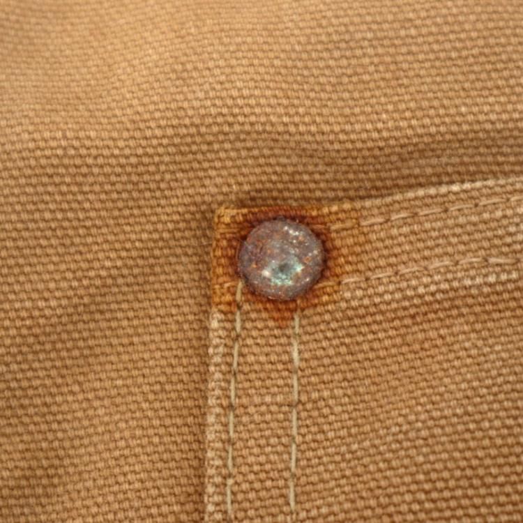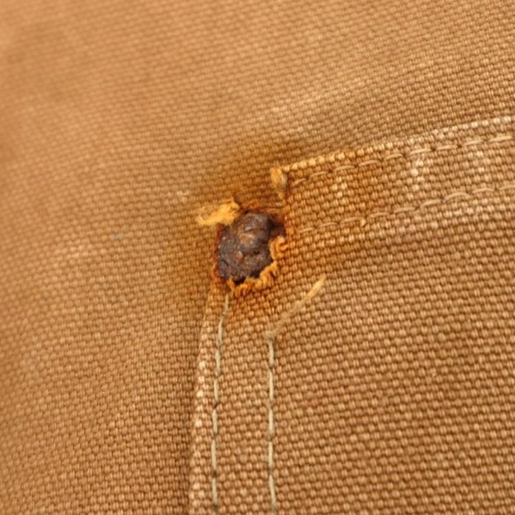 全体的に汚れとシミ、ボタンとリベットにサビがあります。 タグが付いてある方のポケットで、リベットの錆で生地が劣化しリベットに沿って生地が切れています。