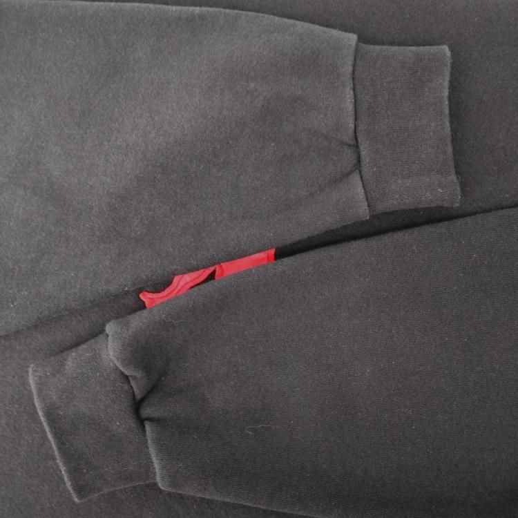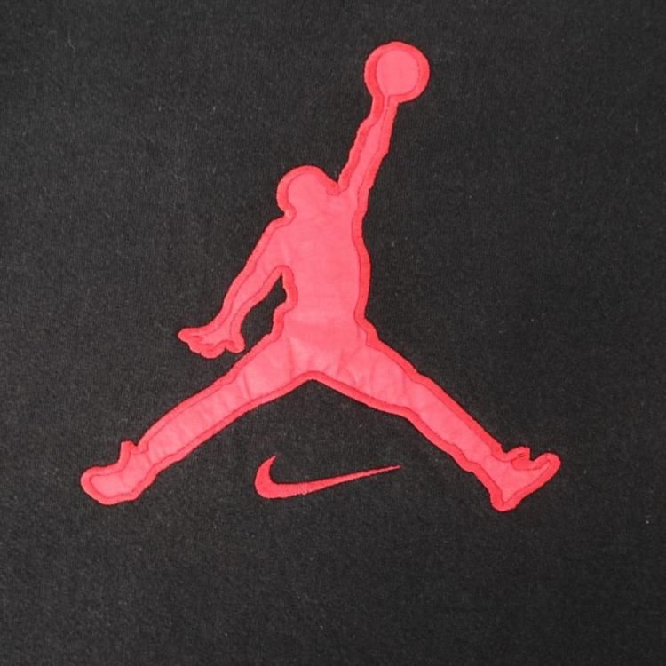 コメント:人気のブート? ナイキのスエット トレーナーです。 エアジョーダンでお馴染みのジャンプマンマークを別生地で貼り付け、その周りを刺繍で縫い付けてあるデザインと意外に手が込んでいますね。 黒×赤の定番カラーですが、これがカッコイイです。 タグが後付けでサイズ表記が横に付き、この年代でコットン100%表記のスエット、ジャンプマンマーク下のスウッシュの尾が長すぎる違和感からブートと判断しました。 ボディのデザイン・クオリティは本物と遜色がなく良いので、ボディとタグは本物を使っている可能性があります。
