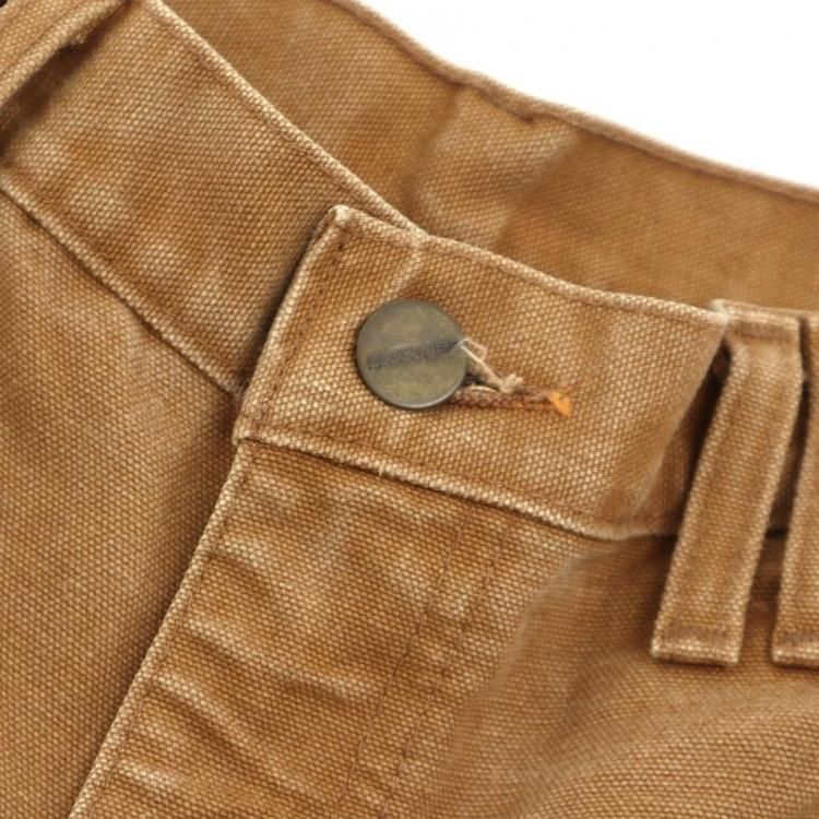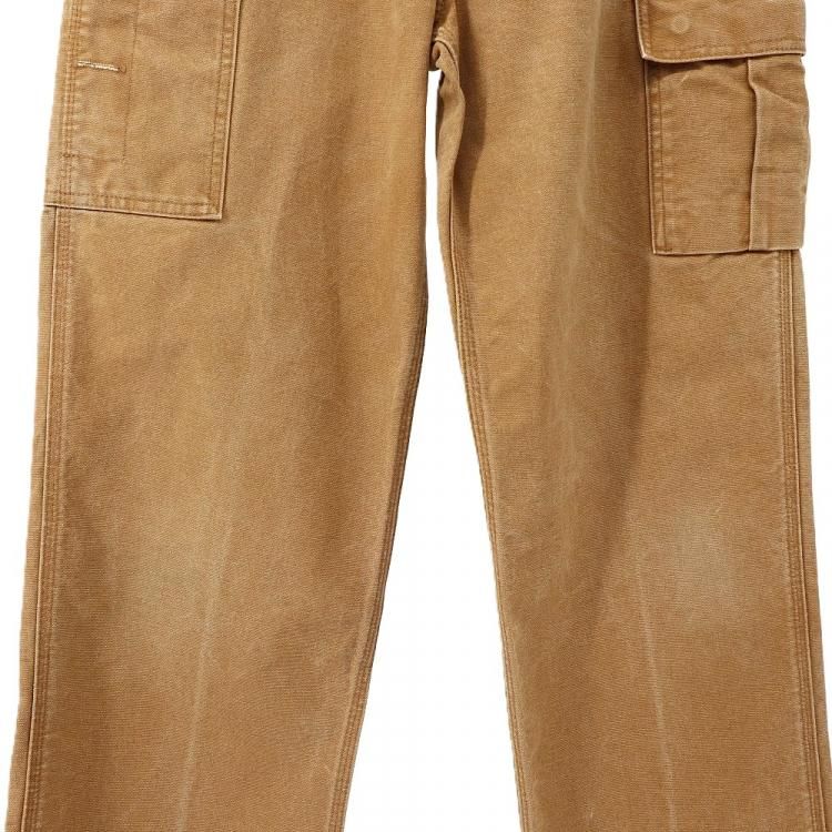 コメント:01年製 カーハートのワークパンツです。 お馴染みブラウンダック地ですが、珍しいカーゴポケットが付くモデル。 ヒップとカーゴポケットにはプリーツがある分、収納力があります。 ワークウェアなので職人さん向けなのは間違いないですが、ハンマーループに、左腰ポケットには何かを引っ掛けられるようループが付き、フロントのベルトループが2本ずつになった謎仕様。 変わり種のカーハートをお探しの方にピッタリではないでしょうか。