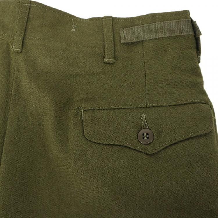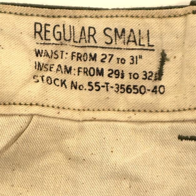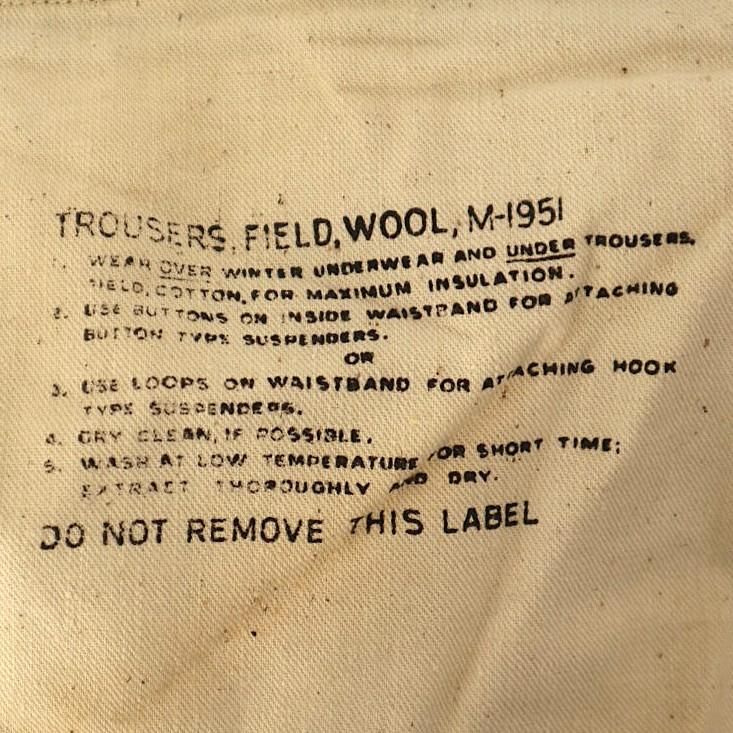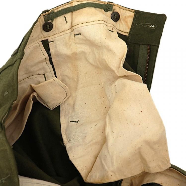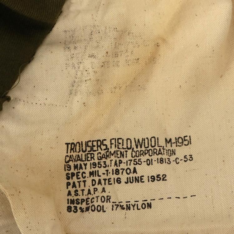 コメント:53年コントラクト 朝鮮戦争時に使用された 米軍実物 M51ウールパンツです。 サスペンダー用も含めボタンは全て平ボタン、RAPID ジップ使用で、厚手のウール生地の冬用になります。 ウール生地ですがFIELD TROUSERS なので野戦用となり、質実剛健と言った言葉が相応しいパンツになります。