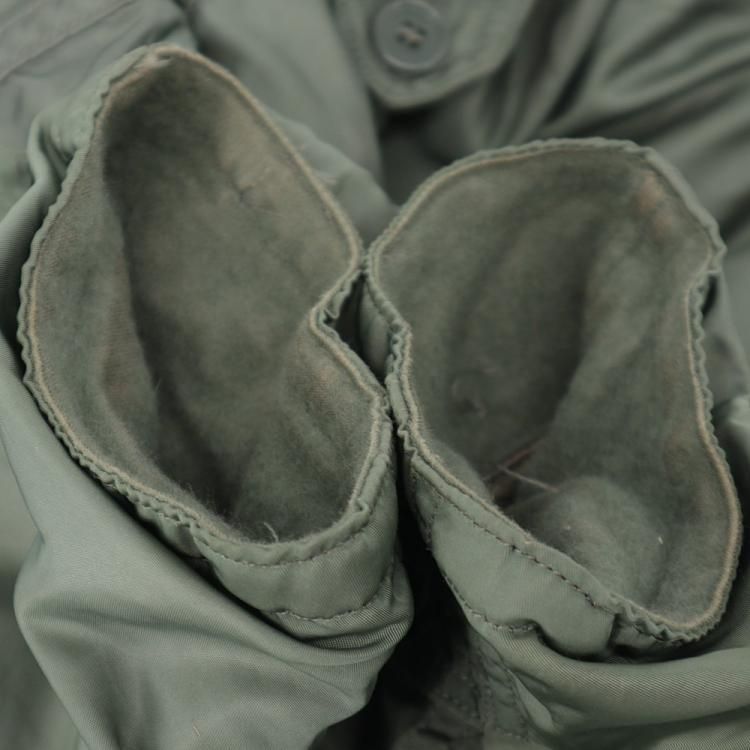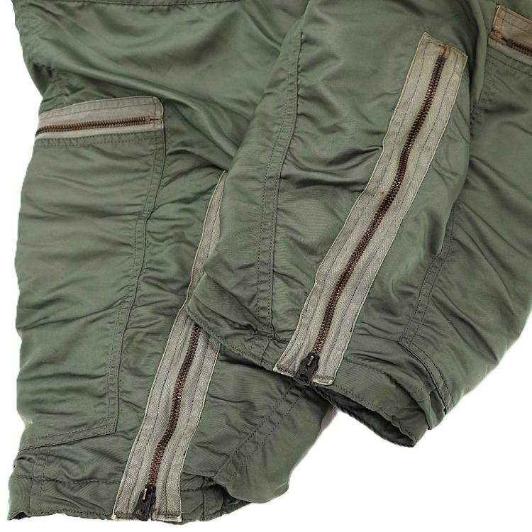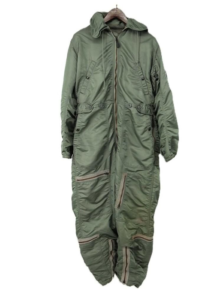 コメント:58年コントラクト ヴィンテージ アメリカ空軍の CWU-1/P パイロットスーツです。 寒冷地用のモデルになり、中綿は入っていませんが防寒性はあります。 足にいっぱい付いたジップがカッコイイですよね。 大き目のポケットが4つ付いています。 襟のドローコード口には革で補強されており、 襟内には薄手のフードが内蔵されています。 ジップは全てコンマー社製で、フロントのメインはコの字留め。 腰サイドのジッパーを下し、後ろのボタンを外せばトイレにも行ける仕様です。