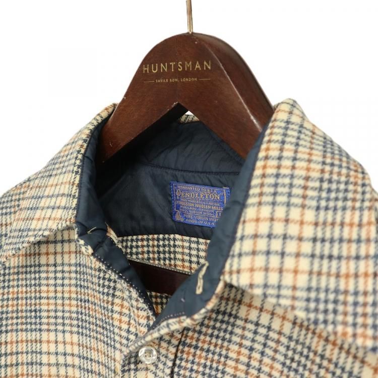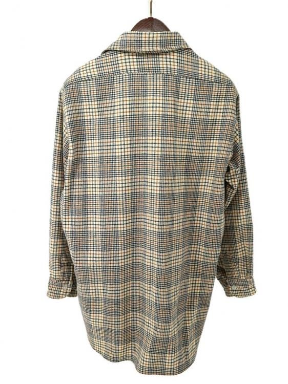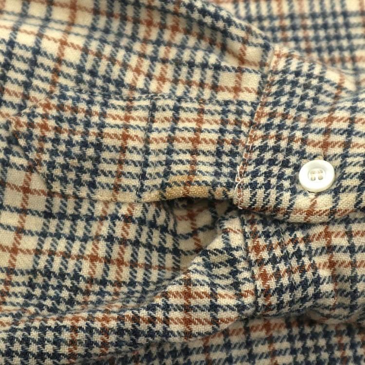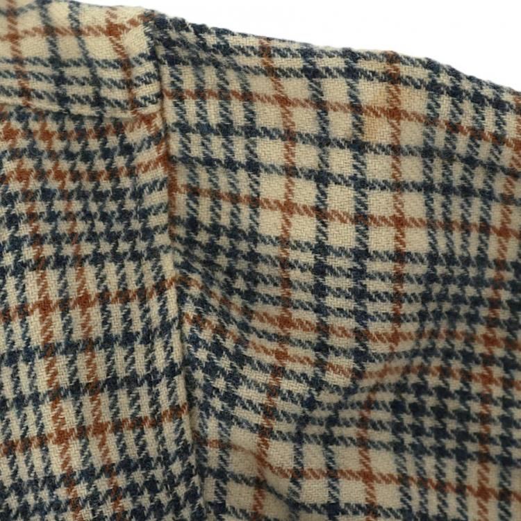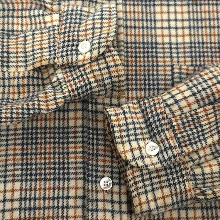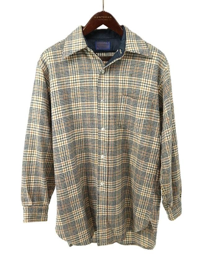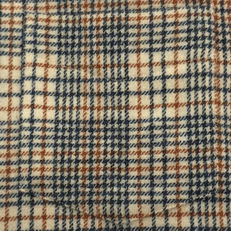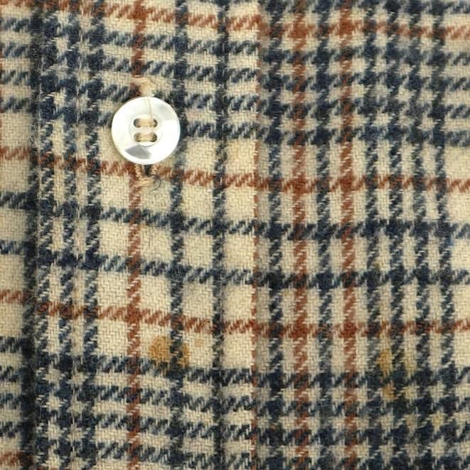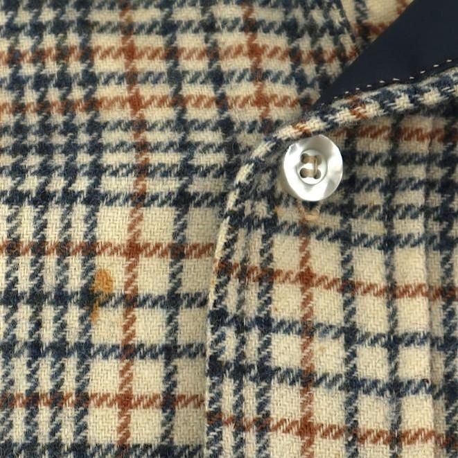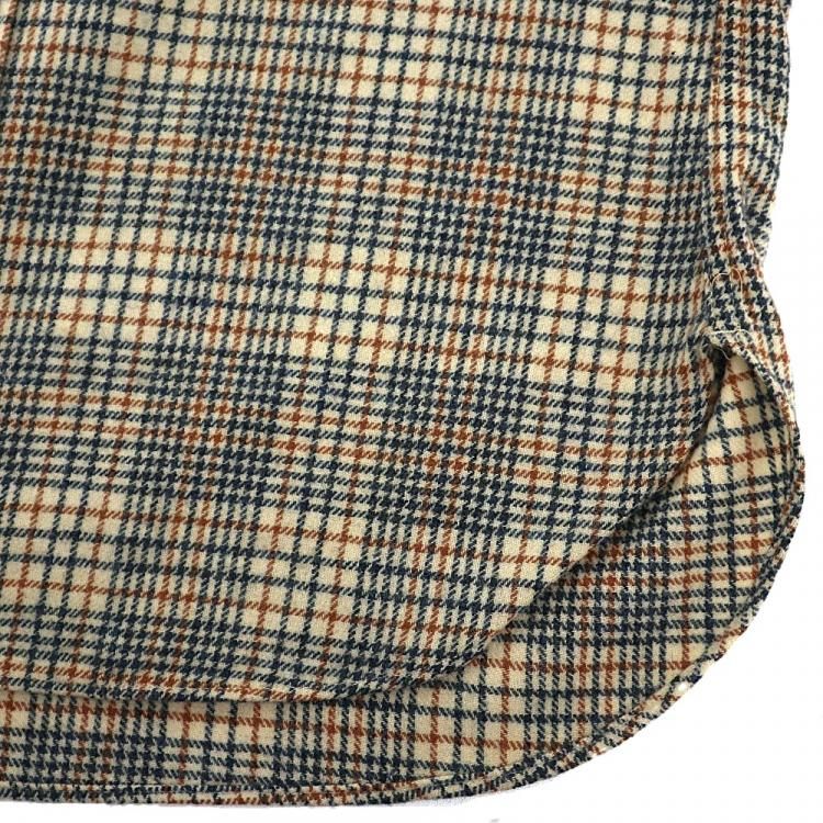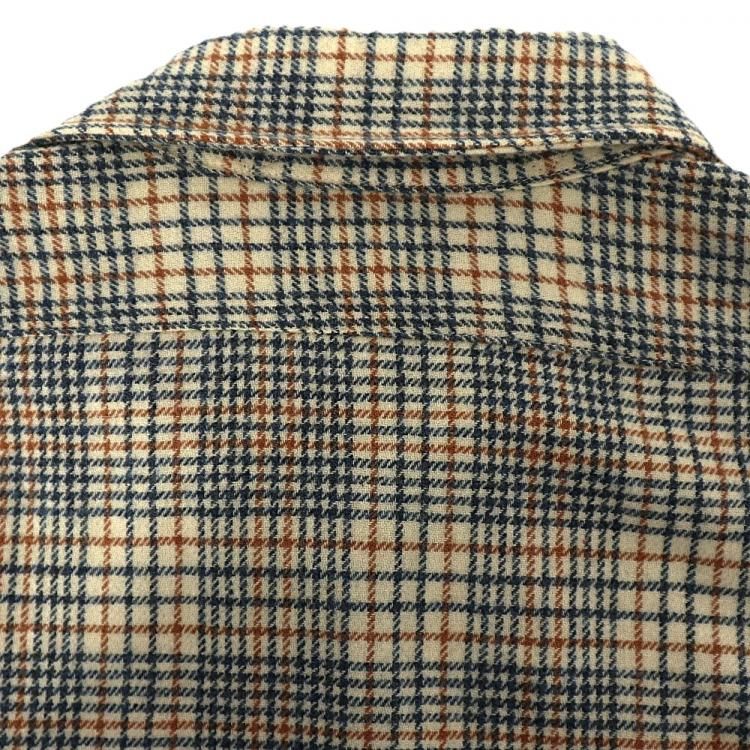 コメント:70年代ヴィンテージのPENDLETON社製ウールシャツです。 胸ポケットは左片側のみのフラップ無しでロッジシャツになるかと思います。 生成りベースの紺×茶色のチェック柄は落ち着いた大人っぽい印象です。