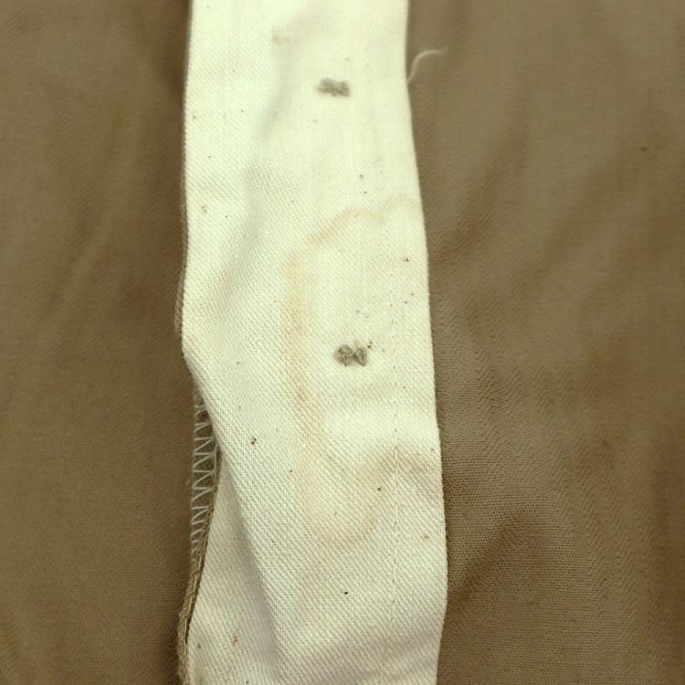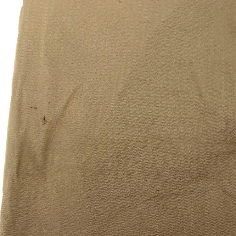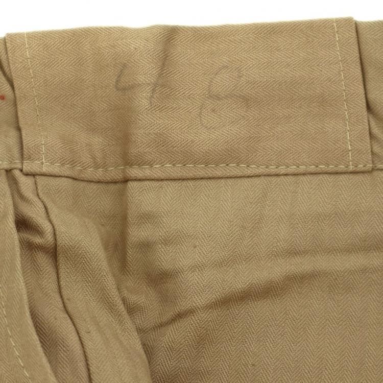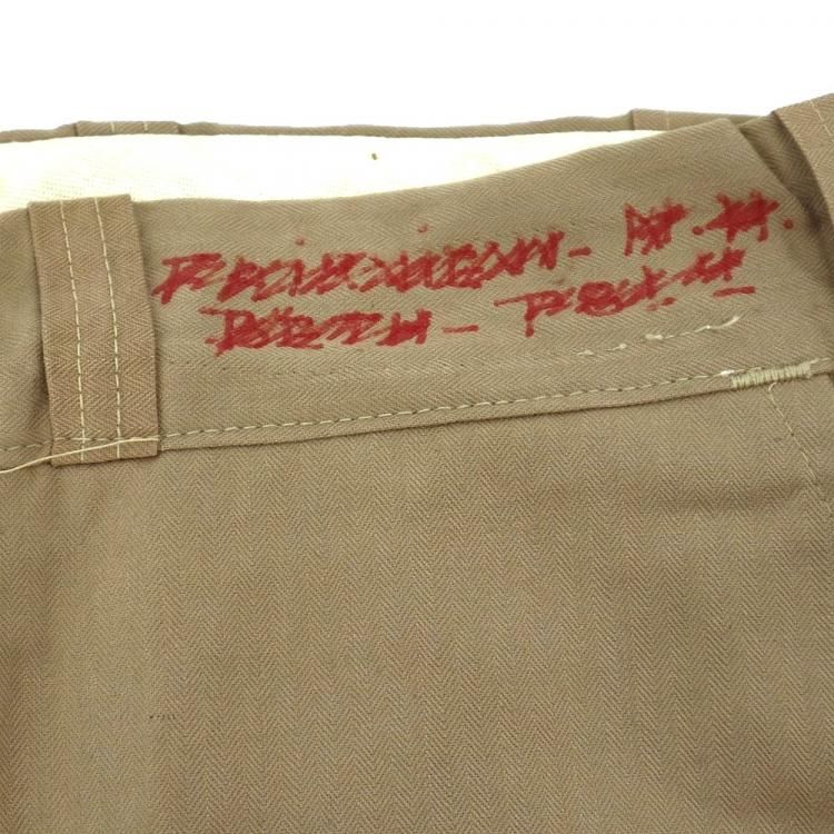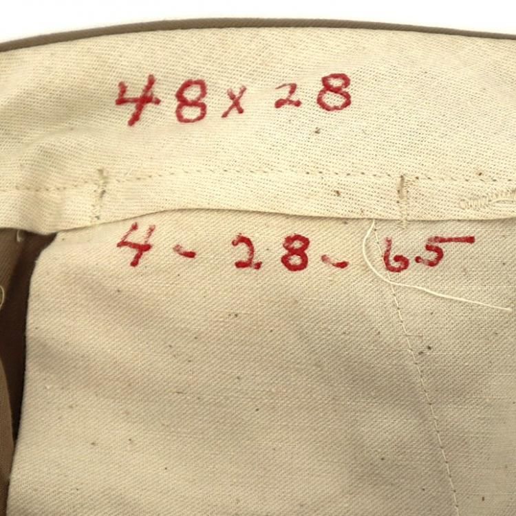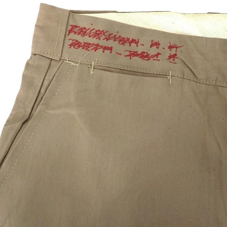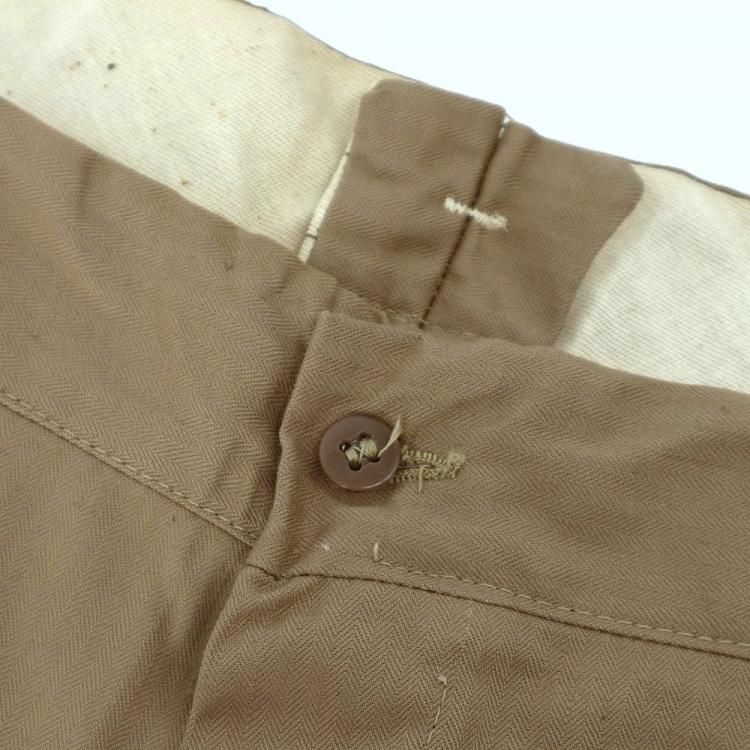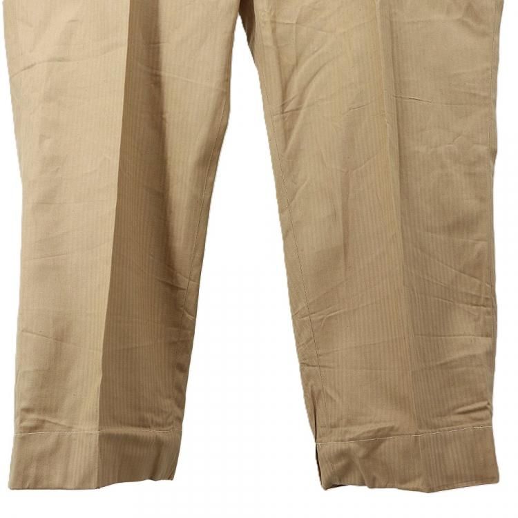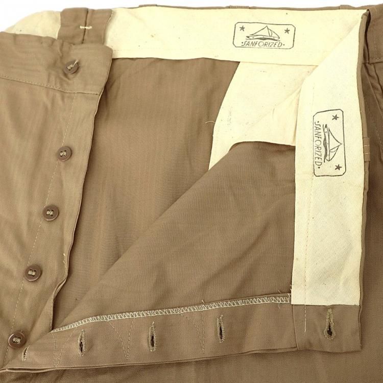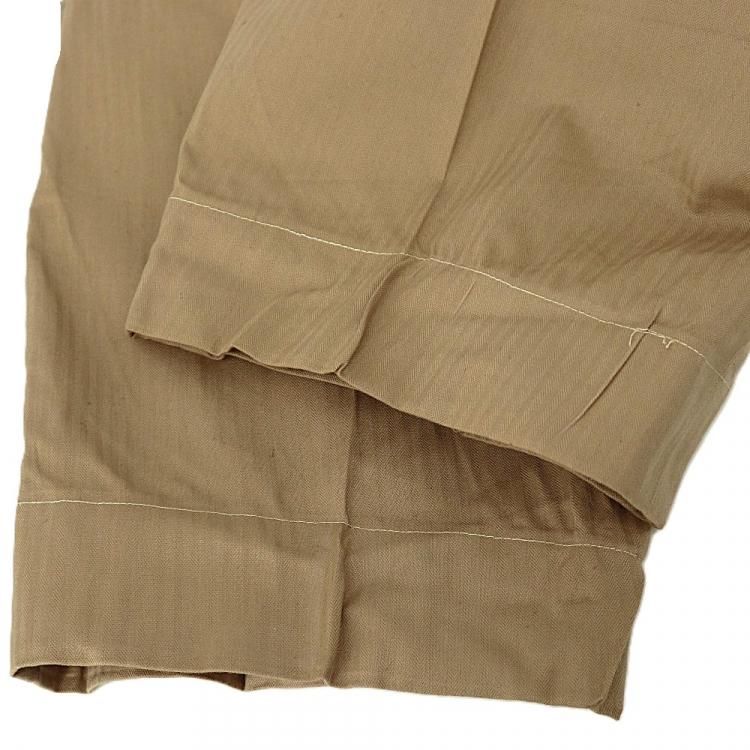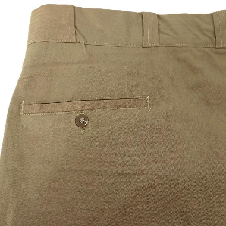 コメント:おそらく40~50年代あたりのワークパンツです。 ベージュ系の防縮加工されたHBT生地で仕立てられ、平ボタンのボタンフライにコインポケット、サイドに幅広いベルトループが付きます。 糸が切れてしまいましたが、右ヒップポケットが閉じられた未使用の状態でした。