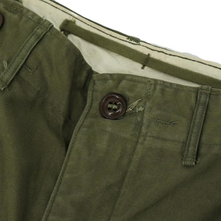コメント:53年コントラクトのヴィンテージM51フィールドパンツ。 色んなブランドがサンプリングしている事でも有名で、今の気分にもマッチするシルエットです。 初期型の茶系の平ボタンで、コンマー のベル型ジップを使用。