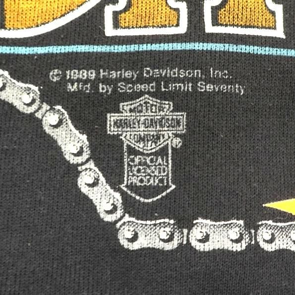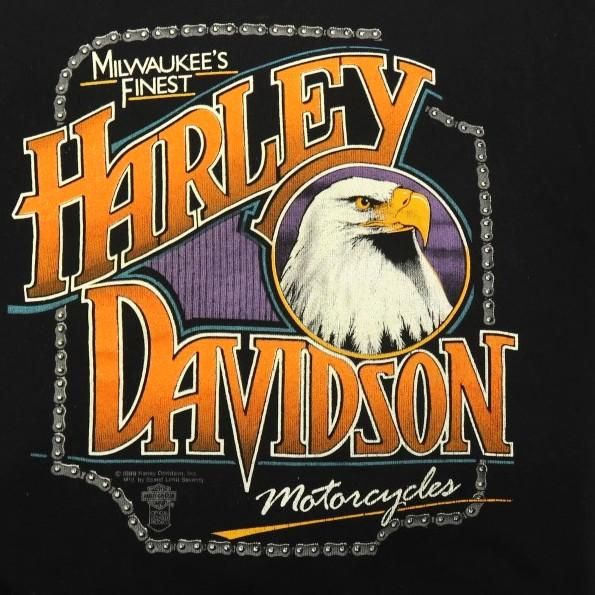 コメント:89年のコピーライト ハーレーのスエット トレーナーです。 チェーンの枠にロゴと白頭鷲のプリント。  やっぱりハーレーのブラックはカッコイイ! 80年代のサイズ感は小さめなので、大きいサイズは嬉しいポイントです。